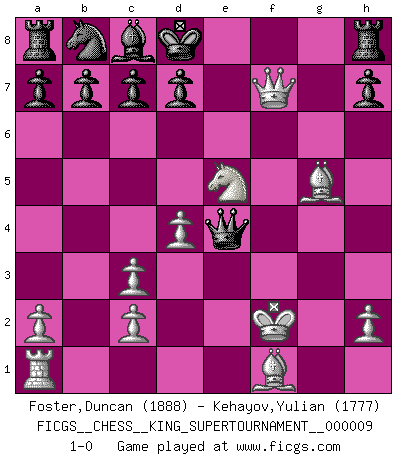 Last move : 1-0 2023 May 10 22:29:48 [Event "FICGS__CHESS__KING_SUPERTOURNAMENT__000009"] [Site "FICGS"] [Date "2023.04.23"] [Round "1"] [White "Foster,Duncan"] [Black "Kehayov,Yulian"] [Result "1-0"] [WhiteElo "1888"] [BlackElo "1777"] 1.e4 e5 2.f4 exf4 3.Nf3 g5 4.d4 g4 5.Ne5 Qh4+ 6.g3 fxg3 7.Qxg4 g2 8.Qxh4 gxh1Q 9.Nc3 Bb4 10.Qh5 Bxc3+ 11.bxc3 Qxe4+ 12.Kf2 Nf6 13.Qxf7+ Kd8 14.Qxf6+ Ke8 15.Qf7+ Kd8 16.Bg5+ 1-0 Follow this game move after move (download)Good positions don't win games, good moves do. (Gerald Abrahams) Die meiste Zeit treffe ich auf Gegner, die meine Enkel sein könnten. Ich bin da, um ihnen zu zeigen, dass sie von mir noch einiges lernen können. (Viktor Kortschnoi) Nos gusta pensar. (Gary Kasparov) On a dit que l'homme se distingue de l'animal par le fait qu'il achète plus de livres qu'il ne peut en lire. Je voudrais suggérer qu'inclure à la liste des livres quelques livres d'échecs rendrait la distinction manifeste. (Edward Lasker) Think like a man of action, act like a man of thought. (Henri Louis Bergson)