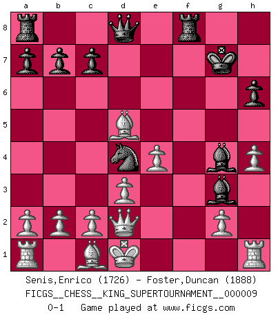 Last move : 0-1 2023 May 19 0:36:0 [Event "FICGS__CHESS__KING_SUPERTOURNAMENT__000009"] [Site "FICGS"] [Date "2023.04.23"] [Round "1"] [White "Senis,Enrico"] [Black "Foster,Duncan"] [Result "0-1"] [WhiteElo "1726"] [BlackElo "1888"] 1.e4 e5 2.f4 exf4 3.Nf3 g5 4.h4 g4 5.Ng5 h6 6.Nxf7 Kxf7 7.Qxg4 Nf6 8.Qxf4 Bd6 9.Qf3 Nc6 10.Bc4+ Kg7 11.d3 Be5 12.Nc3 Nd4 13.Qf2 d5 14.Nxd5 Nxd5 15.Bxd5 Rf8 16.Qd2 Bg3+ 17.Kd1 Bg4+ 0-1 Follow this game move after move (download)There are two classes of men; those who are content to yield to circumstances and who play whist; those who aim to control circumstances, and who play Chess. (Mortimer Collins) Was ist der Unterschied zwischen einem Strassenarbeiter und einem Schachspieler? --Der Schachspieler bewegt sich ab und zu. (Anonymous) Todo se encuentra en un estado de flujo y esto incluye al mundo del Ajedrez. (Mikhail Botvinnik) Je ne suis pas le dernier à jouer lâchement des coups douteux pendant le zeïtnot de l'adversaire pour l'achever: en effet les coups qui font le plus peur sont ceux que l'on ne comprend pas. Je me fais souvent peur quand je joue. (Un professeur anonyme) As the days dwindle down... to a precious few. (Maxwell Anderson)