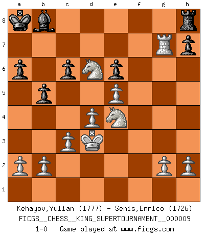Last move : 1-0 2023 June 15 0:15:1 [Event "FICGS__CHESS__KING_SUPERTOURNAMENT__000009"] [Site "FICGS"] [Date "2023.04.23"] [Round "1"] [White "Kehayov,Yulian"] [Black "Senis,Enrico"] [Result "1-0"] [WhiteElo "1777"] [BlackElo "1726"] 1.e4 e5 2.f4 exf4 3.Bc4 Qh4+ 4.Kf1 Bc5 5.Qf3 Nc6 6.d3 Nd4 7.Qd1 d6 8.c3 Bg4 9.Qd2 Ne6 10.d4 Bb6 11.Bxe6 fxe6 12.Qxf4 Be2+ 13.Nxe2 Qe7 14.Na3 a6 15.Be3 Nf6 16.Ng3 Rf8 17.Ke2 Nd5 18.Qg4 Nxe3 19.Kxe3 O-O-O 20.Nc4 Ba7 21.Rhf1 Kb8 22.Kd3 c6 23.Rxf8 Rxf8 24.Rf1 Re8 25.Qf3 Ka8 26.Qf7 b5 27.Nxd6 Qxf7 28.Rxf7 Rd8 29.e5 Bb8 30.Nge4 Rh8 31.Rxg7 1-0 Follow this game move after move (download)Chess is really ninety nine percent calculation. (Soltis) Das typische an einem Großmeister ist, daß er eine gewonnene Position schnell und schmerzlos gewinnt. (Irving Chernev) Aquellos que dicen que entienden al Ajedrez, no entienden nada. (Robert Hubner) Des idées, des idées, j'en ai cent, j'en ai mille. Des bonnes, des mauvaises, applicables, irréalisables... Il suffit de faire le tri ! (Roos) I live to kill Traxler counterattack. (Ilmars Cirulis)