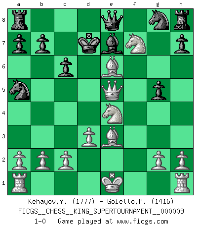Last move : 1-0 2023 May 21 15:15:3 [Event "FICGS__CHESS__KING_SUPERTOURNAMENT__000009"] [Site "FICGS"] [Date "2023.04.23"] [Round "1"] [White "Kehayov,Yulian"] [Black "Goletto,Piero Giuseppe"] [Result "1-0"] [WhiteElo "1777"] [BlackElo "1416"] 1.e4 e5 2.f4 exf4 3.Bc4 Nf6 4.Nc3 Nc6 5.d3 d5 6.exd5 Na5 7.Qe2+ Be6 8.dxe6 fxe6 9.Qxe6+ Be7 10.Nf3 Ng8 11.Qf7+ Kd7 12.Be6+ Kc6 13.Ne5+ Kc5 14.Ne4+ Kb5 15.Bc4+ Kb6 16.Qe6+ c6 17.Bxf4 g5 18.Be3+ Kc7 19.Nf7 Qe8 20.Qe5+ Kd7 21.Be6+ 1-0 Follow this game move after move (download)Only the player with the initiative has the right to attack. (Wilhelm Steinitz) Verschiedene, sehr schätzbare und im Laufe des Lebens nützliche Eigenschaften des Geistes können durch das Schachspiel erworben und gekräftigt werden, so dass sie zu Gewohnheiten werden, die uns nie im Stich lassen. (Benjamin Franklin) Nos gusta pensar. (Gary Kasparov) Même un GMI sait rarement calculer sur plus de cinq coups une attaque à sacrifices. (Rudolf Spielmann) I find television to be very educating. Every time somebody turns on the set, I go in the other room and read a book. (Groucho Marx)