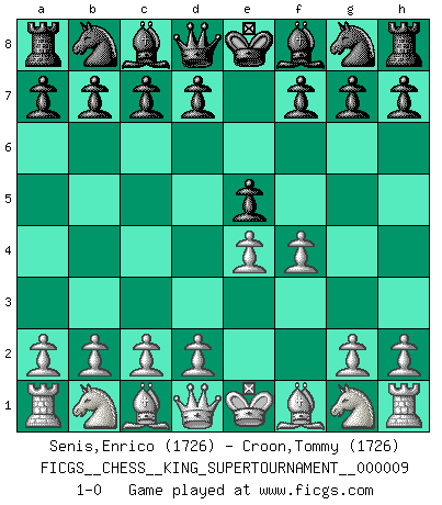Last move : 1-0 2023 May 23 7:2:35 [Event "FICGS__CHESS__KING_SUPERTOURNAMENT__000009"] [Site "FICGS"] [Date "2023.04.23"] [Round "1"] [White "Senis,Enrico"] [Black "Croon,Tommy"] [Result "1-0"] [WhiteElo "1726"] [BlackElo "1726"] 1.e4 e5 2.f4 1-0 This chess game has been lost on time (started : 2023.04.23 2:2:48) Follow this game move after move (download)In Fischer's hands, a slight theoretical advantage is as good a being a Queen ahead. (Isaac Kashdan) Die Arbeit ist etwas Unnatürliches. Die Faulheit allein ist göttlich. (Anatole France) No hay precio que no valga la pena por la cabellera del Rey enemigo. (Koblentz) Un millionnaire : 'Monsieur Steinitz ! Vous ne participez aux tournois que pour l'argent, alors que moi je n'y viens que pour l'honneur.' Steinitz : 'Chacun joue pour ce qu'il n'a pas'... Even the best needles are not sharp at both ends. (Chinese proverb)