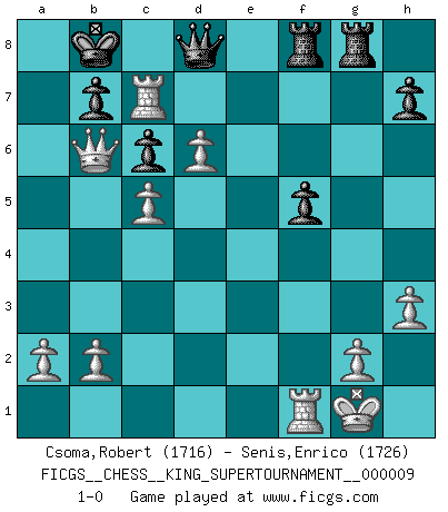 Last move : 1-0 2023 June 15 0:14:8 [Event "FICGS__CHESS__KING_SUPERTOURNAMENT__000009"] [Site "FICGS"] [Date "2023.04.23"] [Round "1"] [White "Csoma,Robert"] [Black "Senis,Enrico"] [Result "1-0"] [WhiteElo "1716"] [BlackElo "1726"] 1.e4 e5 2.f4 exf4 3.Nf3 d6 4.d4 Bg4 5.Bxf4 g5 6.Bxg5 f6 7.Bh4 Qe7 8.Nc3 c6 9.h3 Bh5 10.Bd3 Nd7 11.Qd2 Bh6 12.Qf2 O-O-O 13.O-O Qg7 14.e5 Rf8 15.exd6 Bg5 16.Ne4 Bxf3 17.Qxf3 Bxh4 18.Nc5 Nxc5 19.dxc5 Nh6 20.Bf5+ Nxf5 21.Qxf5+ Qd7 22.Qh5 Bg5 23.Rae1 Bd2 24.Re7 Qd8 25.Rc7+ Kb8 26.Qe2 Bb4 27.Qc4 a5 28.c3 Bxc3 29.Qxc3 Rhg8 30.Qxa5 f5 31.Qb6 1-0 Follow this game move after move (download)Chess is in its essence a game, in its form an art, and in its execution a science. (Baron Tassilo) Jeder weiß, dass Gasprom Putins persönliches Machtinstrument ist. Die Firma wird vom Kreml aus geleitet und wird schon deshalb nie transparent sein. (Garry Kasparov) Las Aperturas te enseñan aperturas. ¡Los Finales te enseñan Ajedrez!. (Stephan Gerzadowicz) Je menace de comprendre la position. (Anonyme) Pretend inferiority and encourage his arrogance. (Sun Tzu)