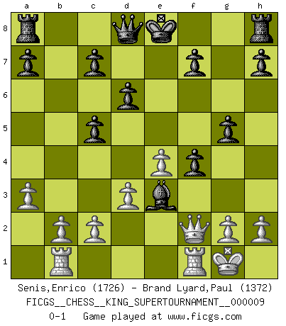Last move : 0-1 2023 May 6 23:5:25 [Event "FICGS__CHESS__KING_SUPERTOURNAMENT__000009"] [Site "FICGS"] [Date "2023.04.23"] [Round "1"] [White "Senis,Enrico"] [Black "Brand Lyard,Paul"] [Result "0-1"] [WhiteElo "1726"] [BlackElo "1372"] 1.e4 e5 2.f4 d6 3.Nf3 exf4 4.Bc4 Bg4 5.O-O Nf6 6.d3 Bxf3 7.Qxf3 g5 8.Nc3 Nc6 9.Qf2 Nb4 10.a3 Nc6 11.Nd5 Nxd5 12.Bxd5 Bg7 13.Bxc6+ bxc6 14.Rb1 c5 15.Bd2 Bd4 16.Be3 Bxe3 0-1 Comment by player 2 : Paul Brand Lyard : -"One bishop Double "Clouage'Queen Trap" will be THE Large Whites problem before the final#"... RESIGN after only 16 moves! Follow this game move after move (download)I had a toothache during the first game. In the second game I had a headache. In the third game it was an attack of rheumatism. In the fourth game, I wasn't feeling well. And in the fifth game? Well, must one have to win every game ? (Siegbert Tarrasch) Über Karpov: Er war und ist ein Vertreter der russischen Reaktionäre. Das steckt tief in seiner Seele, wehalb ich nicht nett mit ihm umgehen kann. (Viktor Kortschnoi) ¿Se han dado cuenta de que Fischer casi nunca ha tenido piezas malas? El las intercambia y las piezas malas se quedan con sus oponenets. (Yuri Balashov) Horreur, mais aussi harmonie suprême : qu'y avait-il en effet au monde en dehors des échecs ? Le brouillard, l'inconnu, le non-être... (Vladimir Nabokov) You can only get smarter by playing a smarter opponent. (Revolver, movie)