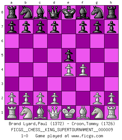 Last move : 1-0 2023 May 23 7:2:35 [Event "FICGS__CHESS__KING_SUPERTOURNAMENT__000009"] [Site "FICGS"] [Date "2023.04.23"] [Round "1"] [White "Brand Lyard,Paul"] [Black "Croon,Tommy"] [Result "1-0"] [WhiteElo "1372"] [BlackElo "1726"] 1.e4 e5 2.f4 1-0 This chess game has been lost on time (started : 2023.04.23 2:2:48) Follow this game move after move (download)In blitz, the Knight is stronger than the Bishop. (Vlastimil Hort) Darum geht es im Schach. Einen Tag gibst du deinem Gegner eine Lektion, am nächsten Tag gibt er dir eine. (Robert James Fischer) Con o sin el título, Bobby Fischer fue sin lugar a dudas el mas grande jugador de su época. (Burt Hochberg) Il s'avisa de me proposer d'apprendre les échecs qu'il jouait un peu... me voilà forcené des échecs. J'achète un échiquier, je m'enferme dans ma chambre, j'y passe des jours et des nuits à vouloir apprendre par cur toutes les parties. (Jean-Jacques Rousseau, Confessions) A mistake is only a mistake if you let it happen twice. Otherwise it is a learning experience. (Daniel Parmet)