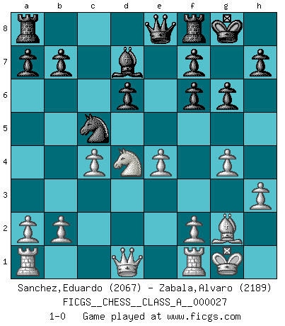 Last move : 1-0 2008 January 16 11:21:48 [Event "FICGS__CHESS__CLASS_A__000027"] [Site "FICGS"] [Date "2007.08.29"] [Round "1"] [White "Sanchez,Eduardo"] [Black "Zabala,Alvaro"] [Result "1-0"] [WhiteElo "2067"] [BlackElo "2189"] 1.d4 Nf6 2.Nf3 g6 3.c4 Bg7 4.Nc3 O-O 5.e4 d6 6.h3 Na6 7.Bg5 Qe8 8.g4 c5 9.Bg2 cxd4 10.Nxd4 Nc5 11.Bxf6 Bxf6 12.Nd5 Bd7 13.Nxf6+ exf6 14.O-O 1-0 This chess game has been lost on time (started : 2007.08.29 16:57:44) King's Indian : East Indian defense Kingside Castling by player Black (move 4) Kingside Castling by player White (move 14) Player White won this chess game. Follow this game move after move (download)If your opponent cannot do anything active, then don't rush the position; instead you should let him sit there, suffer, and beg you for a draw. (Jeremy Silman) Ich bin der einzige Schachspieler, der sich während der Vorbereitungen zum Turnier verletzt hat. (Woody Allen) No soy una persona materialista y por eso, no resiento la falta o pérdida del dinero. La ausencia de cosas mundanas carece de importancia. Ya que el Ajedrez es una forma en la que puedo ser tan materialista como yo desee sin tener la necesidad de vender mi alma. (Jamie Walter Adams) Les échecs sont utiles à l'exercice de la faculté de penser et à celle de l'imagination. Car nous devons posséder une méthode élaborée pour atteindre des buts partout où nous devons conduire notre raison. (Leibnitz) Gambling : The sure way of getting nothing from something. (Wilson Mizner)