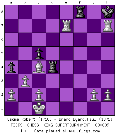 Last move : 1-0 2023 May 11 23:26:9 [Event "FICGS__CHESS__KING_SUPERTOURNAMENT__000009"] [Site "FICGS"] [Date "2023.04.23"] [Round "1"] [White "Csoma,Robert"] [Black "Brand Lyard,Paul"] [Result "1-0"] [WhiteElo "1716"] [BlackElo "1372"] 1.e4 e5 2.f4 d6 3.Nf3 exf4 4.d4 Bg4 5.Bxf4 Nf6 6.Nc3 Bxf3 7.Qxf3 Be7 8.Bc4 O-O 9.O-O-O a5 10.e5 dxe5 11.dxe5 Qc8 12.exf6 Bxf6 13.Nd5 Qe6 14.Bxc7 Qc6 15.Nxf6+ gxf6 16.Qxc6 bxc6 17.Bxb8 Raxb8 18.Rd6 c5 19.Rxf6 Rbd8 20.Re1 Rd4 21.b3 a4 22.Re7 Rfd8 23.R6xf7 Rf8 24.Rg7+ Kh8 25.Rxh7+ 1-0 Follow this game move after move (download)Bobby Fischer is the greatest Chess genius of all time ! (Alexander Kotov) Moralische Siege zählen nicht. (Savielly Grigorievitsch Tartakower) El hombre es un frívolo, una creatura engañosa y como un jugador de Ajedrez, se preocupa mas por el proceso de obtener su meta que de la meta por sí misma. (Dostoyevsky) Ce qui caractérise les parties de combat, c'est que si le défenseur a constamment de difficiles problèmes à résoudre, l'attaquant doit chercher sans relâche de nouvelles possibilités d'attaque. (Koblentz) When a man with money meets a man with experience, the man with experience leaves with money and the man with money leaves with experience. (Anonymous)