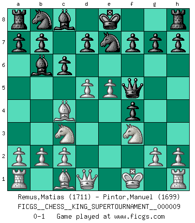 Last move : 0-1 2023 June 1 7:12:13 [Event "FICGS__CHESS__KING_SUPERTOURNAMENT__000009"] [Site "FICGS"] [Date "2023.04.23"] [Round "1"] [White "Remus,Matias"] [Black "Pintor,Manuel"] [Result "0-1"] [WhiteElo "1711"] [BlackElo "1699"] 1.e4 e5 2.f4 exf4 3.Bc4 Qh4+ 4.Kf1 Bc5 5.d4 Bb6 6.Nf3 Qf6 7.Nc3 c6 8.e5 Qf5 9.d5 Ne7 0-1 This chess game has been lost on time (started : 2023.04.23 2:2:48) Follow this game move after move (download)It is always better to sacrifice your opponent's men. (Savielly Tartakower) Ich war zu klein für die Schach-Schülermannschaft! (Woody Allen) Debemos de asegurarnos de que el Ajedrez no se convierta en un lenguaje muerto, muy interesante, pero solo para un grupo muy pequeño. (Sytze Faber) Toutes choses étant égales, c'est la conviction qui gagne. Alliée à une volonté de vaincre, elle sert de détonateur, suscite des idées, disperse les doutes et aide à penser clairement. (Robert Fischer) The Internet is the world's largest library. It's just that all the books are on the floor. (John Allen Paulos)