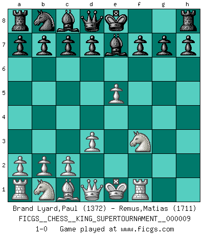Last move : 1-0 2023 May 30 17:15:22 [Event "FICGS__CHESS__KING_SUPERTOURNAMENT__000009"] [Site "FICGS"] [Date "2023.04.23"] [Round "1"] [White "Brand Lyard,Paul"] [Black "Remus,Matias"] [Result "1-0"] [WhiteElo "1372"] [BlackElo "1711"] 1.e4 e5 2.f4 exf4 3.Nf3 Nf6 4.e5 Nh5 5.g4 fxg3 6.hxg3 Nxg3 7.Rg1 Nxf1 8.Rxf1 Be7 9.d3 1-0 This chess game has been lost on time (started : 2023.04.23 2:2:48) Follow this game move after move (download)Morphy was probably the greatest genius of them all. (Bobby Fischer) Schach verlangt totale Konzentration. (Robert James Fischer) Ayuda a tus piezas para que ellas te puedan ayudar. (Paul Morphy) Le jeu d'échecs fait naître et fortifie en nous plusieurs qualités précieuses dans le cours de l'existence, telles que la prévoyance, la circonspection, la prudence, et la persévérance. (Benjamin Franklin - 1783, la morale des échecs) The general who wins the battle makes many calculations in his temple before the battle is fought. The general who loses makes but few calculations beforehand. (Sun Tzu)
