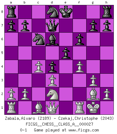 Last move : 0-1 2007 December 20 9:28:25 [Event "FICGS__CHESS__CLASS_A__000027"] [Site "FICGS"] [Date "2007.08.29"] [Round "1"] [White "Zabala,Alvaro"] [Black "Czekaj,Christophe"] [Result "0-1"] [WhiteElo "2189"] [BlackElo "2043"] 1.Nf3 d5 2.g3 Bg4 3.Ne5 Bf5 4.Bg2 f6 5.Nf3 e5 6.d3 Nc6 7.O-O Qd7 8.Nc3 Be6 9.e4 d4 10.Nd5 Nge7 11.c4 Bxd5 12.exd5 Nd8 13.Nd2 c6 14.dxc6 Nexc6 15.f4 Bd6 0-1 This chess game has been lost on time (started : 2007.08.29 16:57:44) Reti : King's Indian attack (Barcza system) Kingside Castling by player White (move 7) Player Black won this chess game. Follow this game move after move (download)If cunning alone were needed to excel, women would be the best Chess players. (Albin) Fischer: 'Remis!?' Uhlmann: 'Aber es muss doch dreimal Zugwiederholung sein!' Fischer: 'Sie nehmen das Remis an, wie ich es sage, sonst spiele ich weiter und werde Sie dann schlagen!' (Robert James Fischer) Las leyes del Ajedrez no permiten una libre elección: tienes que mover quieras o no. (Emanuel Lasker) Les réformistes prétendent que les progrès de la théorie conduiront à la disparition des échecs, et qu'il faut, pour leur rendre vie, en remanier les règles. En réalité, qu'exprime cette affirmation? Le mépris de l'intuition, de l'imagination et de tous les autres éléments qui font des échecs un art. (Alexander Alekhine) A good book on your shelf is a friend that turns its back on you and remains a friend. (Author unknown)