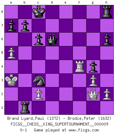 Last move : 0-1 2023 May 9 18:5:39 [Event "FICGS__CHESS__KING_SUPERTOURNAMENT__000009"] [Site "FICGS"] [Date "2023.04.23"] [Round "1"] [White "Brand Lyard,Paul"] [Black "Brodie,Peter"] [Result "0-1"] [WhiteElo "1372"] [BlackElo "1632"] 1.e4 e5 2.f4 exf4 3.Nf3 Nf6 4.Bc4 h6 5.e5 Ng8 6.d4 d5 7.Bb5+ Bd7 8.Bxd7+ Nxd7 9.Bxf4 Be7 10.Nc3 c6 11.g3 g5 12.Be3 f6 13.e6 Nf8 14.Ne5 fxe5 15.dxe5 Nxe6 16.Rf1 Qd7 17.a4 d4 18.Bxd4 Qxd4 19.Qf3 Qxe5+ 20.Kd2 O-O-O 21.Kc1 Nf6 22.Ra2 Nd4 23.Qg2 g4 24.a5 Bb4 25.Ra4 Bxc3 26.Rxf6 Qxf6 27.bxc3 Nb5 28.Rc4 Nxc3 29.Rf4 Rd1+ 30.Kb2 Rb1+ 31.Ka3 Qd6+ 0-1 Follow this game move after move (download)Chess is like war on a board. (Bobby Fischer) Ich verstehe Aljechins Kombinationen ganz gut; aber woher er diese Angriffschancen bekommt und wie er die Eröffnung behandelt das ist für mich ein Buch mit sieben Siegeln. (Rudolf Spielmann) El jugador blanco perdió porque fallo en recordar la coreccta continuación y tuvo que pensar por sí mismo las movidas. (Siegbert Tarrasch) Le plus grand jeu de l'esprit jamais inventé, plus vous l'apprenez, plus vous y prenez du plaisir. (Garry Kasparov) At work, the authority of a person is inversely proportional to the number of pens that person is carrying. (Dan Rotaru)