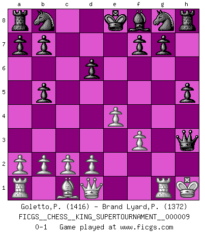 Last move : 0-1 2023 April 30 9:19:40 [Event "FICGS__CHESS__KING_SUPERTOURNAMENT__000009"] [Site "FICGS"] [Date "2023.04.23"] [Round "1"] [White "Goletto,Piero Giuseppe"] [Black "Brand Lyard,Paul"] [Result "0-1"] [WhiteElo "1416"] [BlackElo "1372"] 1.e4 e5 2.f4 d6 3.Bb5+ c6 4.Nc3 cxb5 5.Nf3 exf4 6.O-O Bg4 7.Ne2 Bxf3 8.gxf3 Qg5+ 9.Ng3 fxg3 10.hxg3 Qxg3+ 11.Kh1 h5 12.Rg1 Qh3+ 0-1 Follow this game move after move (download)First-class players lose to second class players because second-class players sometimes play a first-class game. (Tarrasch) Die FIDE ist dabei in die Hände der russischen Mafia zu fallen. (Larry Evans) A través de las casillas del tablero, los Indios explican el movimiento del tiempo y la edad, las influencias mas altas que controlan el mundo y los lazos que vinculan al Ajedrez con el alma humana. (Al-Masudi) Mon pion favori sur ma case favorite ! Bronstein en parlant d'un coup de pion en h5 quand il avait les Noirs. Art is the only way to run away without leaving home. (Twyla Tharp)