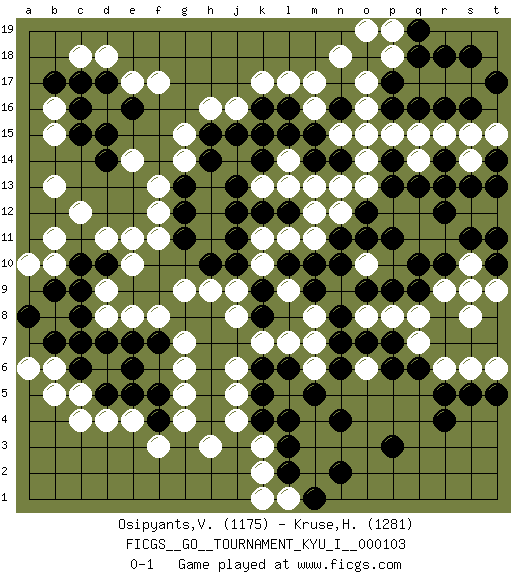 Last move : 0-1 2023 June 19 20:29:41 [Event "FICGS__GO__TOURNAMENT_KYU_I__000103"] [Site "FICGS"] [Date "2023.04.23"] [Round "1"] [Black "Osipyants,Vladimir"] [White "Kruse,Herbert"] [Result "0-1"] [Rating 1 "1175"] [Rating 2 "1281"] 1.q16 d4 2.r4 d16 3.p3 r17 4.r16 q17 5.p17 p18 6.o18 o17 7.p16 n18 8.q18 o19 9.r18 f3 10.k4 f17 11.d10 c12 12.c7 c5 13.q10 o16 14.p13 e11 15.k16 o6 16.q6 o14 17.k14 l7 18.n4 l5 19.l4 d8 20.c8 d9 21.c9 e10 22.d7 f8 23.e6 h16 24.m15 m13 25.h15 g15 26.h14 j16 27.j15 g6 28.f5 h3 29.d5 c4 30.c6 k17 31.l16 l17 32.j12 q8 33.p7 p8 34.o7 r6 35.r5 o8 36.n7 q7 37.p6 o10 38.p11 q14 39.p14 s17 40.s18 p15 41.s16 q15 42.q13 r9 43.r10 r13 44.r12 o13 45.r14 r15 46.s13 s15 47.t17 g14 48.g13 f13 49.g12 f12 50.h10 b10 51.c10 b11 52.b9 e4 53.e5 s6 54.s5 g7 55.f7 e8 56.e7 b6 57.b7 b5 58.a8 k2 59.l2 k3 60.l3 j9 61.j10 l1 62.m1 k1 63.n2 s10 64.s11 s8 65.t10 s9 66.k9 j8 67.k8 k7 68.m9 j4 69.k5 m11 70.l6 k13 71.j13 m6 72.m5 m7 73.n6 k10 74.l10 k11 75.n8 m8 76.n10 l9 77.m10 t9 78.t11 m16 79.m14 l14 80.l15 l13 81.j11 l11 82.n11 n12 83.o11 g9 84.o9 g5 85.f4 g4 86.n16 m17 87.q9 n15 88.n14 o15 89.o12 n13 90.k15 j5 91.k6 j6 92.c17 b16 93.b17 d18 94.c16 b15 95.c15 b13 96.d15 c18 97.e16 e17 98.d17 e14 99.d14 d11 100.p9 t6 101.t5 a10 102.g11 s14 103.r13 h9 104.k12 f11 105.l12 m12 106.q19 p19 107.t14 t15 108.t13 a6 0-1 Follow this game move after move (download)The strong player plays straight, the weak diagonally. (Anonymous) Logic : The art of thinking and reasoning in strict accordance with the limitations and incapacities of the human misunderstanding. (Ambrose Bierce)