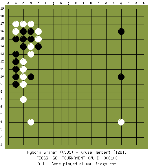 Last move : 0-1 2023 June 8 13:20:39 [Event "FICGS__GO__TOURNAMENT_KYU_I__000103"] [Site "FICGS"] [Date "2023.04.23"] [Round "1"] [Black "Wyborn,Graham"] [White "Kruse,Herbert"] [Result "0-1"] [Rating 1 "0991"] [Rating 2 "1281"] 1.d16 q4 2.q16 d4 3.q10 c17 4.d10 d17 5.c16 e16 6.d15 e15 7.e14 d14 8.c14 d13 9.b15 b16 10.c15 c12 11.b13 b17 12.b12 c11 13.b11 c10 14.b10 c9 15.b9 c7 0-1 This go game has been lost on time (started : 2023.04.23 2:7:19) Follow this game move after move (download)White is always trying to kill a bigger group than black is trying to save. (Anonymous) Whenever people agree with me, I always feel I must be wrong. (Oscar Wilde)