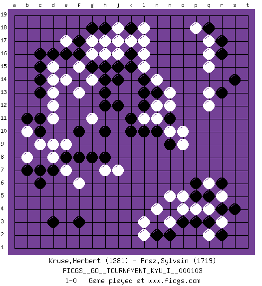 Last move : 1-0 2023 July 17 7:42:31 [Event "FICGS__GO__TOURNAMENT_KYU_I__000103"] [Site "FICGS"] [Date "2023.04.23"] [Round "1"] [Black "Kruse,Herbert"] [White "Praz,Sylvain"] [Result "1-0"] [Rating 1 "1281"] [Rating 2 "1719"] 1.c16 q16 2.r17 q17 3.r16 q15 4.s14 e17 5.d3 d15 6.c15 d14 7.c14 d13 8.c13 d12 9.r4 l16 10.o3 q4 11.q5 r3 12.q3 p4 13.p3 r5 14.s4 q6 15.p5 o4 16.n4 o5 17.p6 n3 18.n2 n5 19.r6 m4 20.m2 l3 21.c11 q2 22.r2 l2 23.r13 q13 24.j17 k17 25.j15 k14 26.k18 l18 27.j14 j13 28.h13 k13 29.h12 d11 30.c10 g17 31.g15 f13 32.h10 h16 33.d16 f15 34.f14 g14 35.h14 j16 36.f16 e14 37.e16 g16 38.k15 l15 39.h15 e9 40.k16 l17 41.f17 j18 42.g18 h17 43.j12 l11 44.l12 m12 45.g8 e7 46.k11 k12 47.l10 m11 48.k10 f6 49.q18 p18 50.f3 h7 51.h18 j17 52.h8 j7 53.m10 q12 54.c6 n10 55.n9 o9 56.n11 o10 57.m13 n12 58.l14 m14 59.l13 n13 60.e8 d8 61.f8 d9 62.d7 b8 63.c7 b10 64.b11 c9 65.b7 g11 66.f10 1-0 Follow this game move after move (download)A knight's move near the edge of the board cannot be cut. (Bill Taylor) All war is based on deception. (Sun Tzu)
