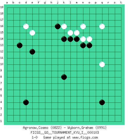 Last move : 1-0 2023 June 12 20:59:15 [Event "FICGS__GO__TOURNAMENT_KYU_I__000103"] [Site "FICGS"] [Date "2023.04.23"] [Round "1"] [Black "Agronow,Cosmo"] [White "Wyborn,Graham"] [Result "1-0"] [Rating 1 "0822"] [Rating 2 "0991"] 1.q4 d16 2.d4 q16 3.c13 e15 4.e12 q10 5.k8 k16 6.k14 l15 7.l14 m15 8.n13 n14 9.o13 o14 10.m14 n16 11.j16 1-0 This go game has been lost on time (started : 2023.04.23 2:7:19) Follow this game move after move (download)If you lose by one point, take a rest. (Anonymous) The man who strikes first admits that his ideas have given out. (Chinese proverb)