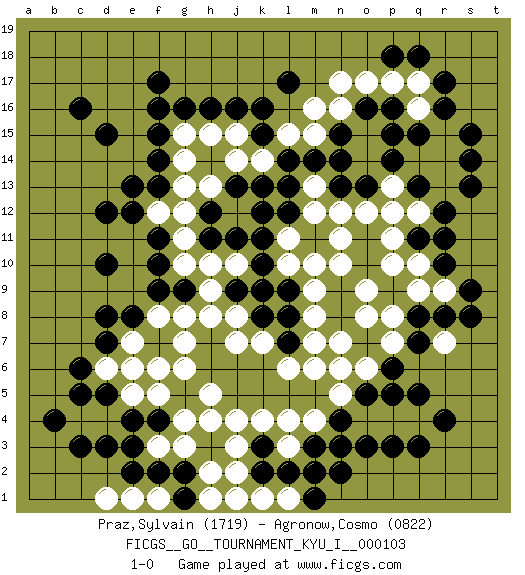 Last move : 1-0 2023 October 26 6:12:14 [Event "FICGS__GO__TOURNAMENT_KYU_I__000103"] [Site "FICGS"] [Date "2023.04.23"] [Round "1"] [Black "Praz,Sylvain"] [White "Agronow,Cosmo"] [Result "1-0"] [Rating 1 "1719"] [Rating 2 "0822"] 1.r16 d4 2.c16 q4 3.f17 q12 4.q15 o12 5.o3 m6 6.o5 p7 7.q5 m4 8.r4 r7 9.q3 p4 10.p5 h4 11.d10 g10 12.c6 e6 13.d8 g14 14.k16 k14 15.o7 o6 16.p6 n6 17.q7 p8 18.q8 q9 19.r8 r9 20.s8 o4 21.n4 n5 22.p3 k4 23.f7 e7 24.e8 f8 25.f4 f5 26.f9 g8 27.g5 g7 28.e4 e5 29.d3 c4 30.c3 g4 31.d5 f6 32.b4 f3 33.e3 h5 34.n13 n12 35.l13 k12 36.k13 j12 37.l12 l11 38.j13 h13 39.h12 g12 40.h11 h10 41.h14 g13 42.m11 m12 43.k11 l10 44.k10 g11 45.j11 k9 46.j9 j10 47.l9 m10 48.k8 n11 49.h16 h15 50.j16 j14 51.l14 l15 52.k15 m13 53.m14 m15 54.n15 n16 55.o16 o15 56.n14 o14 57.o13 p13 58.p14 o17 59.p16 n17 60.l17 j12 61.p15 h9 62.d15 h8 63.d12 g6 64.p9 o8 65.r11 q10 66.s9 n7 67.q11 p10 68.m3 l4 69.q13 p12 70.r12 p11 71.r10 o9 72.g2 g3 73.f2 h2 74.k2 l3 75.l2 m2 76.n3 j2 77.f15 g15 78.f16 j8 79.k9 n10 80.e13 k7 81.l7 l6 82.d7 d6 83.c5 m9 84.k12 m8 85.l8 m7 86.k3 j3 87.n2 k1 88.m1 j1 89.f10 l1 90.m2 j4 91.f11 j15 92.f14 f12 93.e12 j7 94.g16 f1 95.g1 e1 96.e2 m16 97.p18 p17 98.q18 q17 99.r17 q16 100.f13 h1 101.g9 d1 102.pass r15 103.s15 r14 104.s14 r13 105.s13 q14 106.q13 1-0 Follow this game move after move (download)When your opponent is thick, you must also become thick. (Otake Hideo, 9p) The real voyage of discovery consists not in seeking new lands but in seeing with new eyes. (Marcel Proust)