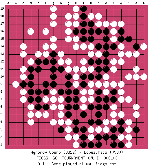Last move : 0-1 2023 September 17 12:52:35 [Event "FICGS__GO__TOURNAMENT_KYU_I__000103"] [Site "FICGS"] [Date "2023.04.23"] [Round "1"] [Black "Agronow,Cosmo"] [White "Lopez,Paco"] [Result "0-1"] [Rating 1 "0822"] [Rating 2 "0900"] 1.q4 d4 2.q16 d16 3.g16 c14 4.h8 o3 5.o6 p5 6.q6 q5 7.r5 p6 8.p7 q7 9.r6 q8 10.o7 p4 11.m4 r4 12.q3 r3 13.p3 o4 14.n5 m3 15.n4 n3 16.k4 r7 17.l3 j3 18.k3 j4 19.j5 g4 20.d8 c11 21.o2 s6 22.n2 m2 23.m1 s5 24.l2 q14 25.o14 p15 26.o16 p16 27.o15 p12 28.o12 n13 29.o13 p11 30.o11 o17 31.m17 n17 32.n16 g14 33.h14 l16 34.l17 g17 35.h15 f16 36.h16 g15 37.g11 f7 38.f8 c7 39.d7 c8 40.c9 e13 41.d11 d12 42.e11 h6 43.j6 h7 44.j7 g8 45.g9 g7 46.e8 d6 47.e6 h5 48.e7 d5 49.f9 h13 50.j13 h12 51.h11 j12 52.k13 j11 53.j10 k10 54.j9 k9 55.j8 l11 56.k12 k11 57.n12 m13 58.m12 l12 59.l13 m14 60.m15 l14 61.j14 k15 62.l15 k14 63.k16 j16 64.h17 j17 65.n14 j15 66.h18 j18 67.j19 g18 68.h19 k19 69.g13 f14 70.g12 c10 71.d10 b9 72.d9 o10 73.n10 n9 74.m10 m9 75.l9 l8 76.l10 o8 77.k8 g19 78.m16 m11 79.n11 m7 80.m6 l6 81.n6 k17 82.l16 q17 83.p14 q13 84.q15 p17 85.p10 o9 86.p8 p9 87.q10 q9 88.q11 q12 89.r12 r13 90.s12 r10 91.r11 s10 92.r15 s13 93.t13 t12 94.t11 s11 95.t12 t14 96.s14 t10 97.n1 k5 98.l5 j2 99.k6 l7 100.e12 c13 101.n7 f5 102.f6 q2 103.p2 r2 104.q1 r1 105.p1 e5 106.k7 m8 107.n8 f13 108.f12 k2 109.l1 k1 110.h3 h4 111.l18 n18 112.s3 g6 113.g10 m18 114.l19 k18 0-1 Follow this game move after move (download)Sacrifice for shape. (Anonymous) Men should grow up. - Yeah. And dogs should stop licking themselves. It's not gonna happen. (Gregory House to Dr. Cameron, House M.D.)