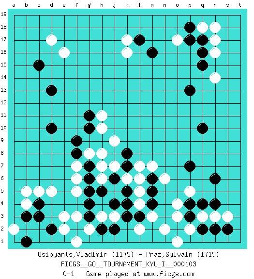 Last move : 0-1 2023 May 19 5:52:12 [Event "FICGS__GO__TOURNAMENT_KYU_I__000103"] [Site "FICGS"] [Date "2023.04.23"] [Round "1"] [Black "Osipyants,Vladimir"] [White "Praz,Sylvain"] [Result "0-1"] [Rating 1 "1175"] [Rating 2 "1719"] 1.q16 d5 2.c3 e3 3.q4 d17 4.c15 e16 5.d13 b4 6.c4 c5 7.b3 b5 8.d2 e2 9.b1 a2 10.k4 f6 11.d10 o17 12.m16 r17 13.q17 r16 14.q15 q18 15.p18 r18 16.p17 r14 17.p13 k17 18.l17 k16 19.q10 r3 20.r4 q3 21.p3 p2 22.o2 o3 23.p4 n2 24.q2 o1 25.r2 o4 26.p7 s3 27.s2 p5 28.r6 k6 29.m5 n6 30.g3 j3 31.j4 h3 32.g4 h6 33.k3 g2 34.f2 f3 35.h2 f1 36.j2 l2 37.l3 m3 38.m6 l5 39.m4 l4 40.k5 l6 41.j6 j7 42.h5 h7 43.k7 l7 44.k8 m7 45.g6 f7 46.g7 g8 47.g5 h8 48.f8 f5 49.f9 h10 50.g11 h11 51.g10 j9 0-1 Follow this game move after move (download)If there is no stone on the handicap point, the carpenter's square is dead. (Anonymous) Thus, what is of supreme importance in war is to attack the enemy's strategy. (Sun Tzu)