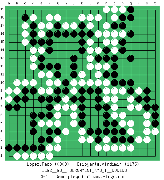Last move : 0-1 2023 July 1 9:53:44 [Event "FICGS__GO__TOURNAMENT_KYU_I__000103"] [Site "FICGS"] [Date "2023.04.23"] [Round "1"] [Black "Lopez,Paco"] [White "Osipyants,Vladimir"] [Result "0-1"] [Rating 1 "0900"] [Rating 2 "1175"] 1.q16 q4 2.d4 c16 3.d17 c17 4.d16 c15 5.g16 d12 6.d6 k4 7.r6 q8 8.r4 r3 9.q3 s4 10.r5 s3 11.p3 p5 12.p4 q5 13.q6 p6 14.r8 q2 15.m3 l3 16.m4 p2 17.o5 o6 18.n5 g3 19.e3 g5 20.d9 c10 21.c9 d10 22.k16 n16 23.o17 n17 24.q13 o16 25.p17 l18 26.n13 n10 27.q10 p9 28.p10 o9 29.n6 o7 30.n7 o8 31.m9 m10 32.k9 l10 33.l9 k10 34.h10 l13 35.j13 m14 36.n14 n15 37.p15 j17 38.k17 k18 39.j16 h17 40.g17 g18 41.d15 d14 42.f14 e14 43.e15 d18 44.e12 e11 45.f12 f11 46.g11 e9 47.e8 f9 48.f8 j6 49.k7 j7 50.j8 h8 51.k6 o2 52.o3 n3 53.o4 m2 54.l4 k3 55.k5 j5 56.m13 l15 57.k15 l12 58.o10 n9 59.n11 m12 60.j11 j9 61.k8 r7 62.s7 r9 63.s8 q7 64.s9 s6 65.q9 o14 66.o13 n12 67.o12 o15 68.p14 e17 69.f16 f17 70.h9 j10 71.f6 g6 72.g8 h7 73.f3 g2 74.e13 d13 75.c18 e16 76.f15 f18 77.k14 l14 78.m7 m11 79.o11 g10 80.g9 f10 81.g12 b9 82.b8 b10 83.c8 a8 84.a7 a9 85.b7 d1 86.c2 c1 87.b2 b1 88.d2 e1 89.m17 l17 90.l16 m16 91.n18 m18 92.p18 n19 93.f4 o18 94.g4 h4 95.h16 f5 96.e6 e5 97.d5 p19 98.q19 o19 99.q18 k11 100.j12 g7 101.f7 f1 102.t6 s5 103.t5 t4 104.t7 n8 105.m8 f2 106.n4 n2 107.a2 p16 108.e2 pass 109.pass pass 110.pass pass 0-1 Follow this game move after move (download)Play slow, win slow; play fast, lose fast. (Anonymous) Mac users swear by their computers. PC users swear at their computers. (Author unknown)