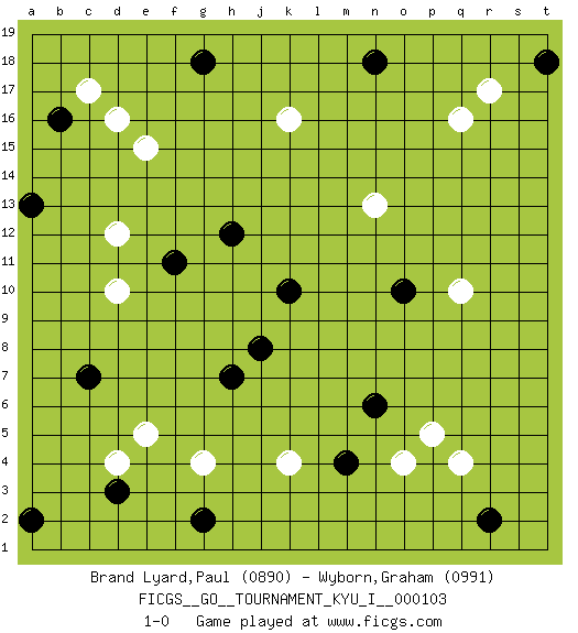 Last move : 1-0 2023 June 11 5:48:56 [Event "FICGS__GO__TOURNAMENT_KYU_I__000103"] [Site "FICGS"] [Date "2023.04.23"] [Round "1"] [Black "Brand Lyard,Paul"] [White "Wyborn,Graham"] [Result "1-0"] [Rating 1 "0890"] [Rating 2 "0991"] 1.r2 d16 2.c7 q10 3.h7 d10 4.o10 q16 5.d3 d4 6.h12 k16 7.a13 q4 8.m4 p5 9.k10 n13 10.g18 e15 11.n18 k4 12.n6 o4 13.t18 r17 14.j8 e5 15.f11 d12 16.g2 g4 17.b16 c17 18.a2 1-0 This go game has been lost on time (started : 2023.04.23 2:7:19) Follow this game move after move (download)Every move brings change. (Pierre Audouard) The meaning of life is that it is to be lived, and it is not to be traded and conceptualized and squeezed into a pattern of systems. (Bruce Lee)
