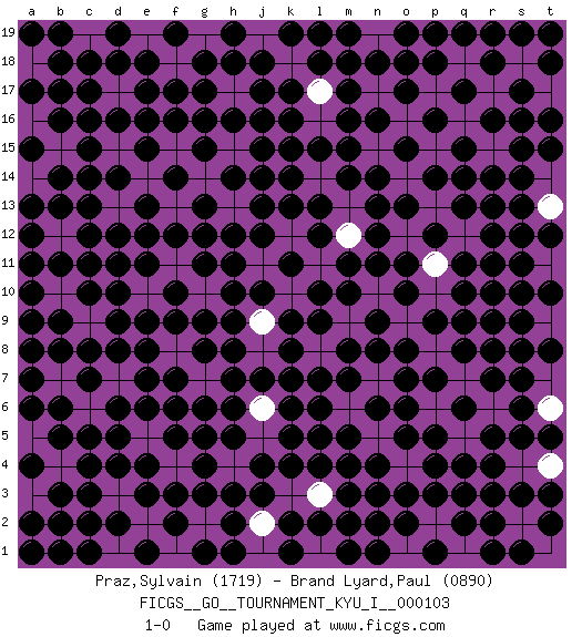 Last move : 1-0 2023 October 5 12:52:54 [Event "FICGS__GO__TOURNAMENT_KYU_I__000103"] [Site "FICGS"] [Date "2023.04.23"] [Round "1"] [Black "Praz,Sylvain"] [White "Brand Lyard,Paul"] [Result "1-0"] [Rating 1 "1719"] [Rating 2 "0890"] 1.r16 j6 2.d16 p13 3.p16 c10 4.d4 k10 5.r4 t9 6.f3 q7 7.p4 o9 8.m4 l16 9.f17 h12 10.c8 h18 11.h16 t14 12.c12 g7 13.r13 n7 14.r10 s2 15.r3 l3 16.m3 o14 17.n16 m12 18.j4 j2 19.h3 q2 20.r2 g10 21.m15 o2 22.m2 e14 23.c14 c6 24.d6 t7 25.c5 s18 26.s17 l8 27.l15 b19 28.c17 s7 29.s12 p11 30.k16 e2 31.c3 k14 32.s5 p19 33.n18 p6 34.o5 m6 35.l5 e10 36.d9 f12 37.d10 g14 38.r8 c2 39.b2 g5 40.r7 n10 41.q8 k19 42.p7 r18 43.t18 r15 44.q15 j9 45.o6 g1 46.e9 b7 47.e7 l17 48.k17 l1 49.f10 k12 50.e11 e19 51.d18 q5 52.g9 j8 53.h10 m9 54.g11 p1 55.l6 d1 56.f2 t4 57.t5 h13 58.k7 b12 59.b13 d13 60.c13 e5 61.d5 o12 62.j7 h7 63.h8 f15 64.g16 m13 65.o7 t11 66.n8 n4 67.m7 t1 68.r1 b16 69.k8 b4 70.b3 j1 71.k9 q12 72.r12 n1 73.j10 b9 74.b8 p17 75.o17 n19 76.m19 f4 77.g4 l4 78.l10 j15 79.k15 d12 80.d11 f8 81.k11 g13 82.m11 k5 83.k4 t3 84.n11 c1 85.o11 p10 86.o10 b1 87.p9 b6 88.e3 d3 89.b5 r6 90.s6 p3 91.q4 s10 92.r11 o3 93.n2 j5 94.e4 r9 95.q10 g6 96.q13 s16 97.s15 j17 98.j16 r14 99.q14 f1 100.m1 t13 101.t16 e8 102.n12 b15 103.b17 l14 104.n13 g19 105.m14 g3 106.f5 f16 107.e17 n5 108.m5 s19 109.j14 n17 110.m17 k2 111.k13 f18 112.g17 b11 113.c11 t8 114.l12 k3 115.e12 e6 116.f6 j18 117.e13 p15 118.pass q18 119.o18 a3 120.a2 d15 121.c15 g2 122.h2 j11 123.l13 o15 124.o13 p8 125.o8 a5 126.c4 k18 127.g18 r17 128.p18 m12 129.q17 c18 130.d19 e5 131.a4 d7 132.c7 a18 133.d8 l9 134.h1 s1 135.e1 l18 136.o19 s4 137.s3 g2 138.d2 l14 139.r5 a14 140.a13 b10 141.p12 h15 142.p14 f1 143.a1 c1 144.g1 f13 145.d14 a8 146.a6 o16 147.a17 a10 148.q19 n15 149.l2 s9 150.j3 h4 151.h5 j13 152.g15 d1 153.h14 j19 154.g8 h15 155.k6 o4 156.f7 b14 157.e15 a16 158.c16 o1 159.p5 l19 160.m18 q1 161.n6 d13 162.m10 b1 163.n3 h17 164.e18 a12 165.m16 f11 166.h11 p2 167.j12 m8 168.n9 s14 169.f19 c19 170.b18 t15 171.s16 t12 172.e16 a7 173.a9 t6 174.q9 c6 175.a8 t10 176.p19 b7 177.r19 a7 178.g12 s8 179.s13 c9 180.pass pass 181.pass pass 182.pass pass 183.pass pass 184.pass pass 185.f14 h13 186.g13 f15 187.f12 pass 188.a19 c19 189.b19 pass 190.pass pass 191.pass pass 192.pass pass 193.t19 s18 194.s19 r17 195.r18 pass 196.t2 t1 197.s1 t4 198.t3 pass 199.q6 pass 200.q11 pass 201.h6 g7 202.f9 j5 203.l7 m9 204.h19 k18 205.j18 f8 206.n14 p15 207.o15 k19 208.s11 t9 209.k1 l3 210.k2 t7 211.q3 p2 212.a15 t11 213.a11 b10 214.b6 o1 215.l18 h17 216.c2 c1 217.h9 q1 218.o3 b15 219.pass l8 220.l9 t14 221.r14 b12 222.b11 b7 223.b16 s9 224.b14 o4 225.n4 g6 226.t12 j19 227.t10 j9 228.l19 s8 229.s7 t8 230.s10 j19 231.k19 t6 232.r9 t8 233.o2 s9 234.q2 l17 235.p3 t7 236.n1 c9 237.p1 p11 238.b9 t9 239.c10 d1 240.m8 t6 241.s14 k3 242.c18 pass 243.s8 j2 244.a12 t7 245.l4 t9 246.d12 t13 247.k14 h7 248.a10 l3 249.a7 t6 250.e6 h12 251.e8 t8 252.g5 g7 253.f16 g6 254.g3 j17 255.b1 d1 256.h18 h17 257.j13 h13 258.h7 g7 259.s9 t7 260.c1 t9 261.g6 t6 262.j17 j6 263.k5 j6 264.t8 t6 265.t15 t13 266.j15 pass 267.h12 1-0 Follow this game move after move (download)In opponents' sphere of influence, avoid sharp conflict, don't move too deep. (Otake Hideo, 9p) Optimism is a variety of information deficit. Sometimes especially true for correspondence chess games. (Michael Aigner)