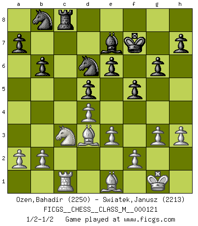 Last move : 1/2-1/2 2023 July 4 18:10:12 [Event "FICGS__CHESS__CLASS_M__000121"] [Site "FICGS"] [Date "2023.04.23"] [Round "1"] [White "Ozen,Bahadir"] [Black "Swiatek,Janusz"] [Result "1/2-1/2"] [WhiteElo "2250"] [BlackElo "2213"] 1.d4 d5 2.c4 e6 3.Nf3 Nf6 4.g3 Bb4+ 5.Bd2 Be7 6.Bg2 O-O 7.O-O c6 8.Qc2 b6 9.Ne5 Bb7 10.Bf4 Nbd7 11.Rd1 Nh5 12.Bd2 Nhf6 13.cxd5 cxd5 14.Nc6 Bxc6 15.Qxc6 Qb8 16.Rc1 Rc8 17.Qxc8+ Qxc8 18.Rxc8+ Rxc8 19.Nc3 Ne8 20.Rc1 Nd6 21.e3 f5 22.h3 Nb8 23.Be1 Kf7 24.Bf1 g6 25.Bd3 1/2-1/2 Follow this game move after move (download)A sacrifice is best refuted by accepting it. (Wilhelm Steinitz) Der Umstand, daß uns eine 7 Stunden Zeitkontrolle ermöglicht eine großartige, tiefe Partie zu spielen, ist für die Massenmedien nicht weiter von Bedeutung. (Alexej Shirov) Tu eres para mi la Reina en d8 y yo soy el Peón en d7!!. (GM Eduard Gufeld) Le temps de noter son nom sur la feuille de partie, j'étais déjà en zeitnot ! D'un modeste amateur apparié lors de la première ronde d'un open contre le grand-maître Azmaïparashvili. Don't anthropomorphize computers - they hate it. (Anonymous)