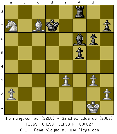 Last move : 0-1 2008 May 30 23:14:37 [Event "FICGS__CHESS__CLASS_A__000027"] [Site "FICGS"] [Date "2007.08.29"] [Round "1"] [White "Hornung,Konrad"] [Black "Sanchez,Eduardo"] [Result "0-1"] [WhiteElo "2260"] [BlackElo "2067"] 1.e4 e5 2.Nf3 Nf6 3.Nxe5 d6 4.Nf3 Nxe4 5.d4 d5 6.Bd3 Nc6 7.O-O Bf5 8.Re1 Be7 9.c4 O-O 10.cxd5 Qxd5 11.Nc3 Nxc3 12.bxc3 Bxd3 13.Qxd3 Rae8 14.Bf4 Qd7 15.Rab1 b6 16.d5 Bf6 17.Qb5 Rxe1+ 18.Rxe1 Ne5 19.Qxd7 Nxd7 20.Bxc7 Bxc3 21.Re7 Nf6 22.d6 Nd5 23.Re4 b5 24.g3 g6 25.Re3 Nxe3 26.fxe3 f5 27.d7 Bf6 28.Nd4 Kf7 29.Nxb5 Ke6 30.Nxa7 Kxd7 0-1 Petrov : Classical attack Kingside Castling by player White (move 7) Kingside Castling by player Black (move 9) Player Black won this chess game. Follow this game move after move (download)I like to say that Bobby Fischer was the greatest player ever. But what made Fischer a genius was his ability to blend an American freshness and pragmatism with Russian ideas about strategy. (Bruce Pandolfini) Im Schach gibt es keinen Platz für Galanterie. (Irving Chernev) Nunca nadie ha ganado una partida de Ajedrez rindiendose. (Unknown) La solitude du joueur d'Echecs à l'approche du mat est semblable à celle du condamné. (Francis Szpiner) All war is based on deception. (Sun Tzu)