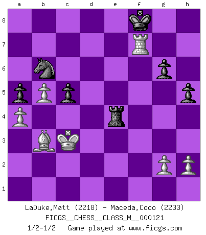 Last move : 1/2-1/2 2023 June 11 0:23:26 [Event "FICGS__CHESS__CLASS_M__000121"] [Site "FICGS"] [Date "2023.04.23"] [Round "1"] [White "LaDuke,Matt"] [Black "Maceda,Coco"] [Result "1/2-1/2"] [WhiteElo "2218"] [BlackElo "2233"] 1.e4 c5 2.Nf3 d6 3.Nc3 Nf6 4.d4 cxd4 5.Nxd4 a6 6.f3 e5 7.Nb3 Be6 8.Be3 h5 9.Nd5 Bxd5 10.exd5 Nbd7 11.Qd2 g6 12.O-O-O Nb6 13.Kb1 Nfxd5 14.Bg5 Be7 15.Bxe7 Qxe7 16.c4 Nf6 17.Qxd6 Qxd6 18.Rxd6 Nbd7 19.Na5 Ke7 20.Rd3 Nc5 21.Re3 e4 22.Be2 Rac8 23.b4 Ne6 24.Rc1 b6 25.Nb3 Rc7 26.a4 Rhc8 27.Kb2 a5 28.c5 bxc5 29.b5 Nd4 30.Bd3 Kf8 31.fxe4 Nxb3 32.Kxb3 Rd8 33.Be2 Rd4 34.Rc4 Nd7 35.Kc3 Rxc4+ 36.Bxc4 Nb6 37.Bb3 Re7 38.Re2 Re5 39.Rf2 Rxe4 40.Rxf7+ 1/2-1/2 Follow this game move after move (download)Chess is war over the board. The object is to crush the opponents mind. (Bobby Fischer) Spielt Blackmar-Diemer-Gambit, und das Matt kommt von selbst! (Emil Joseph Diemer) Evita las multitudes. Haz independientemente tu propio razonamiento. Trata de ser el jugador de Ajedrez, no la pieza de Ajedrez. (Ralph Charell) À la honte des hommes, on sait que les lois du jeu sont les seules qui soient partout justes, claires, inviolables et exécutées. Pourquoi l'Indien qui a donné les règles du jeu d'échecs est-il obéi de bon gré dans toute la terre, et que les décrétales des papes, par exemple, sont aujourd'hui un objet d'horreur et de mépris ? C'est que l'inventeur des échecs combina tout avec justesse pour la satisfaction des joueurs, et que les papes, dans leurs décrétales, n'eurent en vue que leur seul avantage. L'Indien voulut exercer également l'esprit des hommes et leur donner du plaisir; les papes ont voulu abrutir l'esprit des hommes. Voltaire (Dictionnaire philosophique / Garnier 1967) If we don't succeed, we run the risk of failure. (George W. Bush)