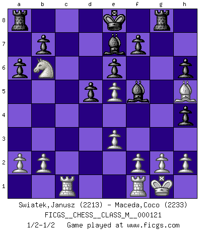 Last move : 1/2-1/2 2023 June 24 22:45:57 [Event "FICGS__CHESS__CLASS_M__000121"] [Site "FICGS"] [Date "2023.04.23"] [Round "1"] [White "Swiatek,Janusz"] [Black "Maceda,Coco"] [Result "1/2-1/2"] [WhiteElo "2213"] [BlackElo "2233"] 1.d4 d5 2.c4 c6 3.cxd5 cxd5 4.Bf4 Nc6 5.e3 Nf6 6.Nc3 a6 7.Be2 Bf5 8.Nf3 e6 9.Qb3 Nh5 10.Bg5 Qc7 11.Ne5 h6 12.Bh4 Nxe5 13.dxe5 g5 14.Bxh5 gxh4 15.O-O Be7 16.Qa4+ Qc6 17.Rac1 Qxa4 18.Nxa4 Rg8 19.Nb6 1/2-1/2 Follow this game move after move (download)Of Chess it has been said that life is not long enough for it, but that is the fault of life, not Chess. (William Ewart Napier) Konzentriere dich auf materielle Gewinne. Nimm, was dir dein Gegner gibt, ausser es gibt einen guten Grund der dagegenspricht. (Robert James Fischer) Estaba muy claro de que el punto vulnerable del Gran Maestro Americano (Bobby Fischer) radicaba en las posiciones de doble filo, colgantes, irracionales, donde el siempre falló en encontrar un triunfo aún en una posición de clara victoria. (Efim Geller) Votre prénom est 'Tactique', votre deuxième prénom est 'Tactique' et votre nom est 'Tactique'. (Ken Smith) Ah, the Socrating method. The best way we have of teaching everything-apart from juggling chainsaws. (Gregory House, House M.D.)