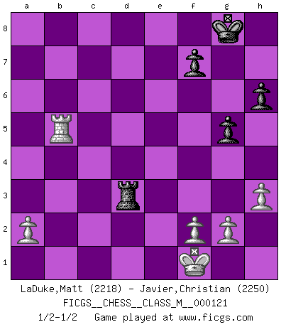 Last move : 1/2-1/2 2023 July 7 6:39:9 [Event "FICGS__CHESS__CLASS_M__000121"] [Site "FICGS"] [Date "2023.04.23"] [Round "1"] [White "LaDuke,Matt"] [Black "Javier,Christian"] [Result "1/2-1/2"] [WhiteElo "2218"] [BlackElo "2250"] 1.e4 c5 2.Nf3 Nc6 3.Bb5 e6 4.O-O Nd4 5.Nxd4 cxd4 6.c3 a6 7.Be2 Bc5 8.Na3 d5 9.exd5 Ne7 10.Nc2 O-O 11.cxd4 Ba7 12.dxe6 Bxe6 13.b3 Nc6 14.Bb2 Nxd4 15.Nxd4 Bxd4 16.Bxd4 Qxd4 17.d3 Rfd8 18.Re1 a5 19.Bf3 Ra7 20.h3 h6 21.Qc2 a4 22.bxa4 Qxa4 23.Qxa4 Rxa4 24.Red1 Bd5 25.Bxd5 Rxd5 26.Rd2 Rad4 27.Rad1 g5 28.Kf1 b5 29.Rb1 Rxd3 30.Rxd3 Rxd3 31.Rxb5 1/2-1/2 Follow this game move after move (download)The passion for playing Chess is one of the most unaccountable in the world. (H.G. Wells) Frage: Was machen Sie mit den Preisen? Anwort: Ich habe Angst, dass meine Freundin davon neue Kleider kauft. (Loek van Wely) Aunque la mayoría de la gente disfruta observar las partidas de los grandes Maestros de ataque, algunos de los jugadores mas notables en la historia han sido los jugadores silenciosos posicionales. Lentamente ellos te aplastan despojandote de tu espacio, congestionando tus piezas y dejandote virtualmente sin nada que hacer. (Yasser Seirawan) Les erreurs sont comme les malheurs, elles n'arrivent jamais seules. (Siegbert Tarrasch) Methinks King Thibault should dub Marius Zubac a knight of the square board... I mean table, henceforth addressing him as Sir Marius, and bestow on him a suitable land from the kingdom of FICGS & marry him off to a worthy, fair maiden, lest he slice our heads with his mighty sword in his wrath. (Dinesh De Silva)