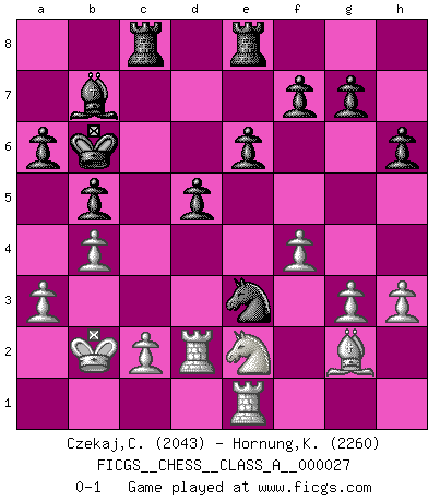 Last move : 0-1 2008 January 18 14:23:28 [Event "FICGS__CHESS__CLASS_A__000027"] [Site "FICGS"] [Date "2007.08.29"] [Round "1"] [White "Czekaj,Christophe"] [Black "Hornung,Konrad"] [Result "0-1"] [WhiteElo "2043"] [BlackElo "2260"] 1.Nc3 c5 2.Nf3 Nf6 3.d4 cxd4 4.Nxd4 Nc6 5.Bg5 e6 6.Qd2 Be7 7.e4 Nxe4 8.Bxe7 Nxd2 9.Bxd8 Nxd4 10.Kxd2 Kxd8 11.Ne4 Ke7 12.f4 d5 13.Nc3 a6 14.g3 Bd7 15.Bg2 Kd6 16.Rad1 Nc6 17.Kc1 Rad8 18.Rhe1 Kc7 19.Kb1 Rhe8 20.a3 Bc8 21.h3 h6 22.Re2 Ne7 23.Rde1 b5 24.b3 Bb7 25.Kb2 Kb6 26.b4 Rc8 27.Rd2 Nf5 28.Ne2 Ne3 0-1 Dunst (Sleipner, Heinrichsen) Opening Player Black won this chess game. Follow this game move after move (download)A sacrifice is best refuted by accepting it. (Wilhelm Steinitz) Der Umstand, daß uns eine 7 Stunden Zeitkontrolle ermöglicht eine großartige, tiefe Partie zu spielen, ist für die Massenmedien nicht weiter von Bedeutung. (Alexej Shirov) Los errores estan ahí, esperando a que se cometan. (Savielly Tartakower) D'abord les bases : Jouez et étudiez, puis étudiez et jouez, ensuite jouez et étudiez, puis étudiez et jouez. Deuxièmement : Donnez toujours le meilleur de vous-même ! (Ken Smith) Computers have lots of memory but no imagination. (Anonymous)