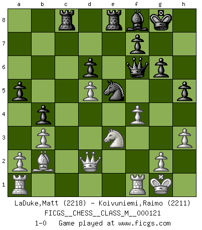 Last move : 1-0 2023 June 14 13:44:16 [Event "FICGS__CHESS__CLASS_M__000121"] [Site "FICGS"] [Date "2023.04.23"] [Round "1"] [White "LaDuke,Matt"] [Black "Koivuniemi,Raimo"] [Result "1-0"] [WhiteElo "2218"] [BlackElo "2211"] 1.e4 e5 2.Nf3 Nc6 3.Bb5 a6 4.Ba4 Nf6 5.O-O Be7 6.Re1 b5 7.Bb3 d6 8.c3 O-O 9.h3 Na5 10.Bc2 c5 11.d4 cxd4 12.cxd4 exd4 13.Nxd4 Bd7 14.Nc3 Re8 15.Qd3 Nc4 16.b3 Ne5 17.Qd2 Rc8 18.Bb2 b4 19.Nd5 Nxd5 20.exd5 a5 21.Bf5 Bf8 22.Red1 Bxf5 23.Nxf5 h5 24.Rf1 Qf6 25.Ne3 g6 26.f4 1-0 Follow this game move after move (download)I'm not a materialistic person, in that, I don't suffer the lack or loss of money. The absence of worldly goods I don't look back on. For Chess is a way I can be as materialistic as I want without having to sell my soul. (Jamie Walter Adams) Modernes Schach erfordert enorme Anspannung. Es ist für einen normalen Menschen unmöglich das auszuhalten. (Viktor Kortschnoi) Me dio la sensación de como si yo estuviera jugando en contra del mismo Ajedrez. - al estar jugando en contra de Robert Fischer (Walter Shipman) Aux échecs, les retours au sommet sont rares : les dommages psychologiques consécutifs à une défaite sont trop sévères. (Daily Telegraph) Chess is as much a mystery as women. (Purdy)