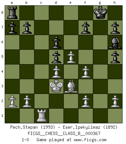 Last move : 1-0 2023 December 21 8:54:0 [Event "FICGS__CHESS__CLASS_B__000367"] [Site "FICGS"] [Date "2023.04.27"] [Round "1"] [White "Pech,Stepan"] [Black "Eser,Ipekyilmaz"] [Result "1-0"] [WhiteElo "1993"] [BlackElo "1892"] 1.c4 c6 2.d4 d6 3.e4 g6 4.Nc3 Bg7 5.Nf3 Bg4 6.Be3 Kf8 7.Qd2 Bxf3 8.gxf3 Nf6 9.O-O-O Nh5 10.f4 Nd7 11.Be2 Qa5 12.e5 Nb6 13.c5 Nd5 14.Nxd5 Qxd2+ 15.Kxd2 cxd5 16.cxd6 exd6 17.Rc1 Bh6 18.Bxh5 gxh5 19.Rhg1 Rg8 20.Rxg8+ Kxg8 21.Kd3 1-0 Follow this game move after move (download)A player surprised is half beaten. (Proverb) Habe Mut, dich deines eigenen Verstandes zu bedienen. (Immanuel Kant) Buenas posiciones no logran ganar juegos, buenas movidas sí. (Gerald Abrahams) Les échecs, c'est l'imagination. (David Bronstein) Memory... is the diary that we all carry with us. (Oscar Wilde, The Importance of Being Earnest)