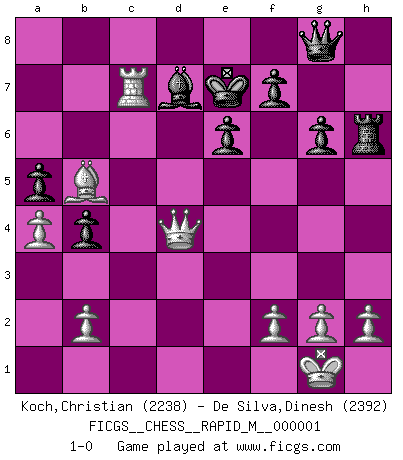 Last move : 1-0 2006 August 13 17:34:13 [Event "FICGS__CHESS__RAPID_M__000001"] [Site "FICGS"] [Date "2006.04.10"] [Round "1"] [White "Koch,Christian"] [Black "De Silva,Dinesh"] [Result "1-0"] [WhiteElo "2238"] [BlackElo "2392"] 1.d4 Nf6 2.c4 e6 3.Nf3 d5 4.Nc3 c6 5.e3 Nbd7 6.Bd3 dxc4 7.Bxc4 b5 8.Be2 Bb7 9.O-O a6 10.e4 c5 11.e5 Nd5 12.a4 b4 13.Ne4 Qc7 14.Qd3 h6 15.Bd2 Be7 16.Rac1 Rc8 17.Ne1 Qb8 18.Qg3 cxd4 19.Rxc8+ Bxc8 20.Nd6+ Bxd6 21.exd6 g6 22.Nd3 a5 23.Ne5 Qxd6 24.Bb5 Qb6 25.Rc1 Ke7 26.Qh4+ N7f6 27.Rc6 Qd8 28.Bxh6 Qg8 29.Qxd4 Nd7 30.Nxd7 Bxd7 31.Qc5+ Kf6 32.Qxd5 Rxh6 33.Qd4+ Ke7 34.Rc7 1-0 This chess game has been lost on time (started : 2006.04.10 22:19:4) Queen's pawn game Kingside Castling by player White (move 9) Player White won this chess game. Follow this game move after move (download)Nothing excites jaded Grandmasters more than a theoretical novelty. (Dominic Lawson) Ich tröste mich mit dem Vergnügen, daß Schachfans, Zuschauer und Leser glücklich sind, wenn ein Großmeister etwas riskiert, statt nur Klötzchen zu schieben. (Mikhail Nekhemyevich Tal) El Ajedrez es tortura mental. (Garry Kasparov) Assurément je connaissais par expérience le mystérieux attrait de ce jeu royal, le seul entre tous les jeux inventés par les hommes qui échappe souverainement à la tyrannie du hasard, le seul où l'on ne doive sa victoire qu'à son intelligence ou plutôt à une certaine forme d'intelligence. Mais n'est-ce pas déjà le limiter injurieusement que d'appeler les échecs un jeu ? N'est-ce pas une science, un art ou quelque chose qui, comme le cercueil de Mahomet entre ciel et terre, est suspendu entre l'un et l'autre, et qui réunit un nombre incroyable de contraires ? [...] C'est une pensée qui ne mène à rien, une mathématique qui n'établit rien, un art qui ne laisse pas d'uvre, une architecture sans matière; et il l'a prouvé néanmoins qu'il était plus durable, à sa manière, que les livres ou que tout autre monument, ce jeu unique qui appartient à tous les peuples et à tous les temps, et dont personne ne sait quel dieu en fit don à la terre pour tuer l'ennui, pour aiguiser l'esprit et stimuler l'âme. Où commence-t-il, où finit-il ? (Stefan Zweig) A journey of a thousand sites begins with a single click. (Author unknown)