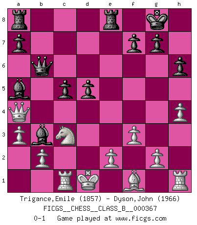Last move : 0-1 2023 May 26 5:6:17 [Event "FICGS__CHESS__CLASS_B__000367"] [Site "FICGS"] [Date "2023.04.27"] [Round "1"] [White "Trigance,Emile"] [Black "Dyson,John"] [Result "0-1"] [WhiteElo "1857"] [BlackElo "1966"] 1.c4 e5 2.Nc3 Nf6 3.Nf3 Nc6 4.d4 exd4 5.Nxd4 Bb4 6.Bg5 O-O 7.Rc1 h6 8.Bh4 Re8 9.f3 Nxd4 10.Qxd4 c5 11.Qd3 b5 12.a3 bxc4 13.Qxc4 d5 14.Bxf6 Qxf6 15.Qd3 Ba6 16.Qc2 Ba5 17.Qa4 Qb6 18.Kd1 Bc4 19.h4 Bb3+ 0-1 Follow this game move after move (download)Chess opens and enriches your mind. (Saudin Robovic) Zeige mir drei Eröffnungsvarianten und ich beweise dir, dass zwei davon inkorrekt sind. (Emanuel Lasker) Debió haber existido una vez en que los hombres eran semidióses, de otra manera no hubiesen podido inventar el Ajedrez. (Gustav Schenk) Il n'y a plus de joueurs du niveau de Jacob Murray dont la seule quête est le beau jeu, le plaisir de voir les pièces construire quelque chose. Sur 10 idées à la minute, 9 seront sans intérêt, la dernière s'avèrera géniale. (Christian Bauer) Luck never gives; it only lends. (Swedish proverb)