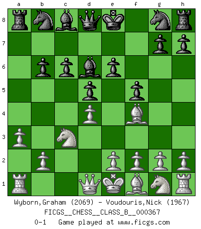 Last move : 0-1 2023 June 9 14:20:28 [Event "FICGS__CHESS__CLASS_B__000367"] [Site "FICGS"] [Date "2023.04.27"] [Round "1"] [White "Wyborn,Graham"] [Black "Voudouris,Nick"] [Result "0-1"] [WhiteElo "2069"] [BlackElo "1967"] 1.d4 d5 2.c4 e6 3.a3 f5 4.Nc3 c6 5.c5 b6 6.cxb6 axb6 7.Bf4 Bd6 0-1 This chess game has been lost on time (started : 2023.04.27 21:18:53) Follow this game move after move (download)Fischer sacrificed virtually everything most of us weakies (to use his term) value, respect, and cherish, for the sake of an artful, often beautiful board game, for the ambivalent privilege of being its greatest master. (Paul Kollar) Wie gewinnt Tal? Er entwickelt alle seine Figuren in die Brettmitte und opfert sie dann irgendwo. (Robert James Fischer) La táctica fluye a partir de una posición superior. (Bobby Fischer) La vie est comme un jeu d'échecs : nous esquissons un plan, mais celui-ci est tributaire de ce que daignent faire l'adversaire aux échecs et le destin dans la vie. (Arthur Schopenhauer) A person who never made a mistake never tried anything new. (Albert Einstein)