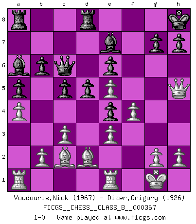 Last move : 1-0 2023 September 20 0:22:0 [Event "FICGS__CHESS__CLASS_B__000367"] [Site "FICGS"] [Date "2023.04.27"] [Round "1"] [White "Voudouris,Nick"] [Black "Dizer,Grigory"] [Result "1-0"] [WhiteElo "1967"] [BlackElo "1926"] 1.d4 d5 2.e3 e6 3.f4 Nf6 4.Bd3 Be7 5.Nf3 O-O 6.Nbd2 c5 7.c3 b6 8.Qe2 Bb7 9.Ne5 Ne4 10.O-O f6 11.Ng4 Qc8 12.Qf3 Nc6 13.Qe2 f5 14.Ne5 Nxe5 15.dxe5 a6 16.a4 Rd8 17.Rd1 Qc6 18.Nxe4 fxe4 19.Bc2 Kh8 20.Bd2 a5 21.Re1 Ba6 22.Qh5 1-0 Follow this game move after move (download)He who fears an isolated Queen's Pawn should give up Chess. (Siegbert Tarrasch) Schach ist ein Teil der Kultur, und wenn es mit der Kultur abwärts geht, geht es auch mit dem Schach abwärts. (Mikhail Moiseyevich Botvinik) Dejen al perfeccionista jugar por correo. (Yasser Seirawan) Vous m'avez demandé de vous exposer quel est le fondement de la prière. Je ne fais que préparer les pièces du jeu sur la table... Nous sera-t-il permis d'en adopter les règles et si nous les appliquons scrupuleusement nous ne tarderons pas à faire mat le Roi divin ! Il ne pourra échapper à nos mains. (Sainte Thérèse d'Avila, Chemin de perfection) Do not put your faith in what statistics say until you have carefully considered what they do not say. (William W. Watt)