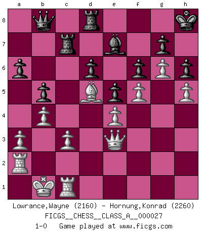 Last move : 1-0 2008 October 3 22:27:53 [Event "FICGS__CHESS__CLASS_A__000027"] [Site "FICGS"] [Date "2007.08.29"] [Round "1"] [White "Lowrance,Wayne"] [Black "Hornung,Konrad"] [Result "1-0"] [WhiteElo "2160"] [BlackElo "2260"] 1.e4 c5 2.Nf3 d6 3.d4 cxd4 4.Nxd4 Nf6 5.Nc3 a6 6.Bg5 e6 7.f4 Be7 8.Qf3 Qc7 9.O-O-O Nbd7 10.g4 b5 11.Bxf6 Nxf6 12.Bg2 Bb7 13.g5 Nd7 14.a3 Nb6 15.h4 O-O 16.f5 e5 17.Nb3 f6 18.g6 h6 19.Na5 Na4 20.Nxb7 Nxc3 21.Qxc3 Qxb7 22.Qb3+ Kh8 23.Rhe1 Rab8 24.Bf1 Rfc8 25.Kb1 Rc5 26.Qe6 Bf8 27.Rd2 Rd8 28.h5 Rdc8 29.Qb3 Rb8 30.c3 Qb6 31.Rd5 Rc7 32.Qc2 Be7 33.Red1 Rc6 34.Qd2 Kg8 35.Bd3 Kh8 36.Bc2 Qc7 37.Bb3 Rcb6 38.Rc1 Qb7 39.Qe2 Bd8 40.Rd2 Be7 41.Bd5 Qc7 42.Qf3 Rc8 43.Be6 Rd8 44.Qe3 Qb8 45.b4 Rb7 46.Bd5 Rc7 47.Ra2 1-0 Sicilian : Najdorf, 7...Be7 Queenside Castling by player White (move 9) Kingside Castling by player Black (move 15) Player White won this chess game. Follow this game move after move (download)Examine moves that smite! A good eye for smites is far more important than a knowledge of strategical principles. (Purdy) Ich organisiere ein großes Turnier, was mich etwa 120000 Dollar kostet. Ich denke, das ist das erste Mal in der Schachgeschichte, daß ein Schachgroßmeister auch als Mäzen auftritt. (Miguel Najdorf) Yo no creo en la psicología. Yo creo en las buenas movidas. (Bobby Fischer) Les échecs, c'est l'art d'analyser. (Mikhail Botvinnik) Life is like a game of cards: the hand you are dealt represents determinism; the way you play it is free will. (Jawaharlal Nehru)