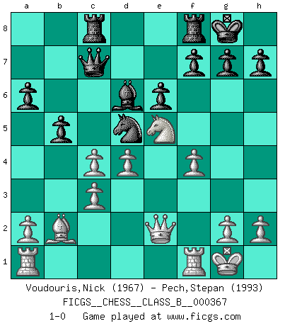 Last move : 1-0 2023 October 4 9:5:8 [Event "FICGS__CHESS__CLASS_B__000367"] [Site "FICGS"] [Date "2023.04.27"] [Round "1"] [White "Voudouris,Nick"] [Black "Pech,Stepan"] [Result "1-0"] [WhiteElo "1967"] [BlackElo "1993"] 1.d4 Nf6 2.f4 d5 3.e3 c5 4.c3 Qc7 5.Bd3 Bg4 6.Nf3 Nc6 7.O-O e6 8.Qe1 Bf5 9.Qe2 Bd6 10.Ne5 O-O 11.b3 Bxd3 12.Qxd3 Rac8 13.Nd2 b5 14.Bb2 a6 15.Qe2 c4 16.e4 Nxe4 17.Nxe4 dxe4 18.Qxe4 Ne7 19.Qe2 Nd5 20.bxc4 1-0 Follow this game move after move (download)First-class players lose to second class players because second-class players sometimes play a first-class game. (Tarrasch) Der Schachmeister von Heute braucht Courage, einen Killerinstinkt, Ausdauer und Arroganz. (Larry Evans) Muchos jugadores de Ajedrez se sorprendían cuando después de la partida, Fischer explicaba con calma: 'Yo ya había analizado esta posibilidad' en una posición en la cual yo creía que no era posible de prever desde la apertura. (Mikhail Tal) Il a essayé de se convaincre qu'il pourrait empêcher toutes les erreurs et ne jamais perdre. L'horreur ! Gary Kasparov au sujet de Robert Fischer. A woman without a man is like a fish without a bicycle. (Gloria Steinem)
