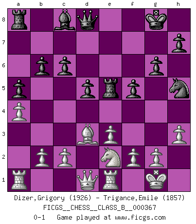 Last move : 0-1 2023 August 11 5:45:23 [Event "FICGS__CHESS__CLASS_B__000367"] [Site "FICGS"] [Date "2023.04.27"] [Round "1"] [White "Dizer,Grigory"] [Black "Trigance,Emile"] [Result "0-1"] [WhiteElo "1926"] [BlackElo "1857"] 1.Nc3 d5 2.d4 Nf6 3.Nf3 g6 4.Bf4 Bg7 5.e3 O-O 6.Nb5 Na6 7.Nc3 Nb8 8.Be2 c6 9.h3 b6 10.O-O Nbd7 11.a4 a5 12.Re1 Re8 13.Bd3 Nh5 14.Bh2 f5 15.Ne2 e5 16.dxe5 Nxe5 17.Nxe5 Bxe5 18.Bxe5 Rxe5 0-1 This chess game has been lost on time (started : 2023.04.27 21:18:53) Follow this game move after move (download)With or without the title, Bobby Fischer was unquestionably the greatest player of his time. (Burt Hochberg) Ich verachte die Medien. (Robert James Fischer) Morphy probablemente fue el genio más grande de todos. (Bobby Fischer) Karpov est une pièce de musée. (Garry Kasparov) Man with more than one clock never knows what time it is. (Chinese thought)