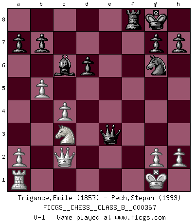 Last move : 0-1 2023 November 8 17:16:58 [Event "FICGS__CHESS__CLASS_B__000367"] [Site "FICGS"] [Date "2023.04.27"] [Round "1"] [White "Trigance,Emile"] [Black "Pech,Stepan"] [Result "0-1"] [WhiteElo "1857"] [BlackElo "1993"] 1.c4 e5 2.Nc3 Nc6 3.Nf3 f5 4.d4 e4 5.Bg5 Be7 6.Bxe7 Ncxe7 7.Nd2 Nf6 8.e3 O-O 9.Be2 d6 10.b4 Qe8 11.O-O Qg6 12.f4 exf3 13.Bxf3 Qh6 14.Qe1 c6 15.e4 Ng6 16.exf5 Bxf5 17.Nde4 Nxe4 18.Bxe4 Rae8 19.d5 Bxe4 20.Rxf8+ Nxf8 21.dxc6 Bxc6 22.Qf2 Ng6 23.b5 Rf8 24.Qc2 Qe3+ 0-1 Follow this game move after move (download)I don't believe in psychology. I believe in good moves. (Bobby Fischer) Stil? Ich habe keinen Stil! (Anatoly Karpov) Si yo gano un torneo, yo lo gano por mí mismo. Yo hago las jugadas. Nadie me ayuda. (Bobby Fischer) Le profane ne songe pas à la somme de jouissance dont il se prive, qui méconnaît ce jeu aux ressources aussi variées que passionnantes. (Jean-Marie Jeanton-Lamarche) No enterprise is more likely to succeed than one concealed from the enemy until it is ripe for execution. (Niccolo Machiavelli)