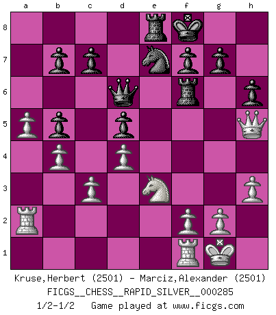 Last move : 1/2-1/2 2023 May 22 19:1:8 [Event "FICGS__CHESS__RAPID_SILVER__000285"] [Site "FICGS"] [Date "2023.05.05"] [Round "1"] [White "Kruse,Herbert"] [Black "Marciz,Alexander"] [Result "1/2-1/2"] [WhiteElo "2501"] [BlackElo "2501"] 1.e4 e5 2.Nf3 Nf6 3.Nxe5 d6 4.Nf3 Nxe4 5.d3 Nf6 6.d4 Nc6 7.Bd3 d5 8.O-O Be7 9.c3 O-O 10.h3 Re8 11.a4 h6 12.Na3 a6 13.Bf4 Nh5 14.Bh2 Bd6 15.Ne5 Bxe5 16.Qxh5 Bxh2+ 17.Kxh2 Qd6+ 18.Kg1 Re6 19.Nc2 Bd7 20.a5 Rae8 21.Qf3 Kf8 22.Ne3 Ne7 23.b4 Bb5 24.Bxb5 axb5 25.Ra2 Rf6 26.Qh5 1/2-1/2 Follow this game move after move (download)You have to have the fighting spirit. You have to force moves and take chances. (Bobby Fischer) Ein Isolani verdüstert die Stimmung auf dem ganzen Schachbrett. (Savielly Grigorievitsch Tartakower) El Ajedrez es el juego mas altamente simbólico, pero las agresiones estan por lo tanto aún mas francamente representadas en la partida. Tal vez comenzo como un juego de guerra; Algo como la representación de una batalla en miniatura entre las fuerzas de dos reinos. (Karl Meninger) Dans le domaine de la peinture, de la gravure et de la sculpture, dès la première décennie de notre siècle, les artistes abandonnent la représentation de la partie d'échecs pour se concentrer sur les pièces, sur les échiquiers et sur toutes les variations auxquelles les unes et les autres peuvent donner lieu. On passe en quelque sorte d'un thème social à un thème musical (au sens de la musica médiévale, c'est-à-dire d'une notion qui inclue le rythme, l'harmonie, la construction et la déconstruction, etc.). Graphiquement et picturalement, l'échiquier apparaît comme une structure ouverte, dynamique, d'une richesse infinie, autorisant toutes les combinatoires et débouchant sur des mouvements et des rythmes de nature exponentielle. (Michel Pastoureau) The mind is like a parachute, it only functions when its open. (Unknown)