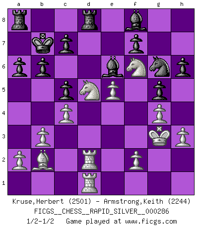 Last move : 1/2-1/2 2023 June 13 10:0:11 [Event "FICGS__CHESS__RAPID_SILVER__000286"] [Site "FICGS"] [Date "2023.05.05"] [Round "1"] [White "Kruse,Herbert"] [Black "Armstrong,Keith"] [Result "1/2-1/2"] [WhiteElo "2501"] [BlackElo "2244"] 1.e4 e5 2.Nf3 Nc6 3.Bb5 Nf6 4.O-O Nxe4 5.d4 Nd6 6.Bxc6 dxc6 7.dxe5 Nf5 8.Qxd8+ Kxd8 9.Nc3 Bd7 10.h3 h6 11.b3 c5 12.Rd1 Kc8 13.Bb2 Be6 14.Nd5 g5 15.c4 b6 16.g4 Ne7 17.Kh2 Ng6 18.Kg3 Be7 19.Nd2 Kb7 20.Ne4 a6 21.Rd2 Rhd8 22.Rad1 Bf8 23.Nef6 1/2-1/2 Follow this game move after move (download)Spassky will not be psyched out by Fischer. (Mike Goodall) Die Leute spielen gegen mich seit 15 Jahren unter Ihren Möglichkeiten. (Robert James Fischer) El Ajedrez es de 30 a 40 por ciento psicología. Uno no cuenta con esto cuando se juega contra una computadora. No lo puedo confundir. (Judith Polgar) Les échecs, c'est l'imagination. (David Bronstein) If computers get too powerful, we can organize them into committees. That'll do them in. (Anonymous)