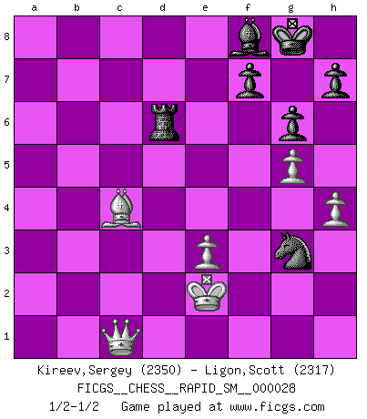 Last move : 1/2-1/2 2023 May 17 21:20:56 [Event "FICGS__CHESS__RAPID_SM__000028"] [Site "FICGS"] [Date "2023.05.05"] [Round "1"] [White "Kireev,Sergey"] [Black "Ligon,Scott"] [Result "1/2-1/2"] [WhiteElo "2350"] [BlackElo "2317"] 1.e4 Nf6 2.e5 Nd5 3.d4 d6 4.Nf3 dxe5 5.Nxe5 c6 6.Be2 Bf5 7.O-O Nd7 8.Nf3 e6 9.c4 N5f6 10.Bf4 Be7 11.Nc3 O-O 12.Re1 Qb6 13.Nh4 Qxb2 14.Nxf5 exf5 15.Na4 Qb4 16.Bf1 Rfe8 17.Rb1 Qa5 18.Rxb7 Bf8 19.Re3 Nb6 20.Nxb6 axb6 21.Qb3 Red8 22.Bg5 f4 23.Bxf4 Rxd4 24.Be5 Rd7 25.Bc3 Qf5 26.Qxb6 Rxa2 27.Rf3 Qe6 28.Rxd7 Nxd7 29.Qb1 Ra3 30.Re3 Qxe3 31.fxe3 Rxc3 32.Qf5 Nc5 33.Qe5 Rc1 34.g4 Rd1 35.h4 g6 36.g5 Nb3 37.Kf2 Rd2+ 38.Kf3 Rd6 39.Bg2 Nd2+ 40.Ke2 Nxc4 41.Qc3 Nb6 42.Bxc6 Nd5 43.Qc1 Ne7 44.Bb5 Nf5 45.Bc4 Ng3+ 1/2-1/2 Follow this game move after move (download)Not all artists are Chess players, but all Chess players are artists. (Marcel Duchamp) Lisa Lane, amerikanische Schachmeisterin, hatte Fischer einmal als stärksten lebenden Spieler bezeichnet. Antwort: Das ist richtig, aber Lisa Lane ist eigentlich nicht in der Lage, das zu beurteilen. (Robert James Fischer) Las ideas audaces son como las piezas del Ajedrez que avanzan hacia adelante. Ellas pueden ser vencidas, pero también pueden iniciar una partida victoriosa. (Goethe) L'action d'une oeuvre littéraire se déroule sur un champ de bataille. Les masques et les types du drame moderne correspondent aux pièces du jeu d'échecs. L'intrigue correspond aux coups et aux gambits, c'est à dire aux techniques du jeu telles qu'utilisées et interprétées par les joueurs. Les tactiques et les péripéties [mouvements] correspondent aux coups exécutés par l'adversaire. (Viktor Shklovsky) Sometimes it pays to stay in bed in Monday, rather than spending the rest of the week debugging Monday's code. (Dan Salomon)