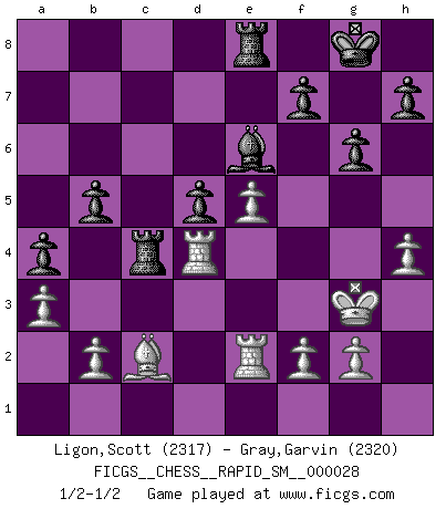 Last move : 1/2-1/2 2023 June 19 16:40:58 [Event "FICGS__CHESS__RAPID_SM__000028"] [Site "FICGS"] [Date "2023.05.05"] [Round "1"] [White "Ligon,Scott"] [Black "Gray,Garvin"] [Result "1/2-1/2"] [WhiteElo "2317"] [BlackElo "2320"] 1.d4 Nf6 2.c4 e6 3.Nf3 Bb4+ 4.Nbd2 Be7 5.e4 d5 6.e5 Nfd7 7.Bd3 c5 8.O-O Nc6 9.Re1 a5 10.Bc2 O-O 11.a3 cxd4 12.cxd5 exd5 13.Nb3 Qb6 14.Qd3 g6 15.Bh6 Re8 16.Nbxd4 Bf8 17.Bxf8 Nxf8 18.h3 Bd7 19.Rad1 a4 20.Re2 Nxd4 21.Qxd4 Qxd4 22.Nxd4 Rac8 23.Kh2 Ne6 24.Kg3 Rc5 25.h4 b5 26.Nxe6 Bxe6 27.Rd4 Rc4 1/2-1/2 Follow this game move after move (download)Before the endgame, the Gods have placed the middle game. (Siegbert Tarrasch) Die starken Figuren des Gegners muss man abtauschen. (José Raúl Capablanca) ¿Esta Bobby Fischer algo cuerdo?. (Salo Flohr) Le jeu d'échecs est comme rejeté hors du temps. (Antoine de Saint-Exupéry) O divine art of subtlety and secrecy! Through you we learn to be invisible, through you inaudible and hence we can hold the enemy's fate in our hands. (Sun Tzu)