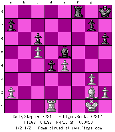 Last move : 1/2-1/2 2023 May 24 11:32:44 [Event "FICGS__CHESS__RAPID_SM__000028"] [Site "FICGS"] [Date "2023.05.05"] [Round "1"] [White "Cade,Stephen"] [Black "Ligon,Scott"] [Result "1/2-1/2"] [WhiteElo "2314"] [BlackElo "2317"] 1.d4 d5 2.Nf3 Bf5 3.g3 e6 4.Bg2 Nf6 5.O-O Be7 6.c4 c6 7.Nc3 h6 8.Nd2 O-O 9.e4 dxe4 10.Ndxe4 Nxe4 11.Nxe4 Nd7 12.Be3 Nf6 13.Nc3 Rc8 14.Qe2 Ng4 15.Rad1 Nxe3 16.fxe3 Bg6 17.Be4 f5 18.Bg2 Bf6 19.c5 b6 20.b4 bxc5 21.bxc5 Kh8 22.Qc4 Bh5 23.Ne2 Qc7 24.Nf4 Bf7 25.e4 e5 26.Ne6 Bxe6 27.Qxe6 exd4 28.Qxf5 Qe5 29.Qxe5 Bxe5 30.Rxf8+ Rxf8 1/2-1/2 Follow this game move after move (download)All Chess players should have a hobby. (Savielly Tartakower) Im Reiche der Wirklichkeit ist man nie so glücklich wie im Reiche der Gedanken. (Arthur Schopenhauer) Siempre es mucho mejor sacrificar las piezas de tu oponente. (Savielly Tartakover) Mais n'est-ce pas déjà le limiter injurieusement que d'appeler les échecs un jeu? N'est-ce pas aussi une science, un art, ou quelque chose qui, comme le cercueil de Mahomet entre ciel et terre, est suspendu entre l'un et l'autre, et qui réunit un nombre incroyable de contraires ? (Stefan Zweig) Computers make it easier to do a lot of things, but most of the things they make it easier to do don't need to be done. (Andy Rooney)
