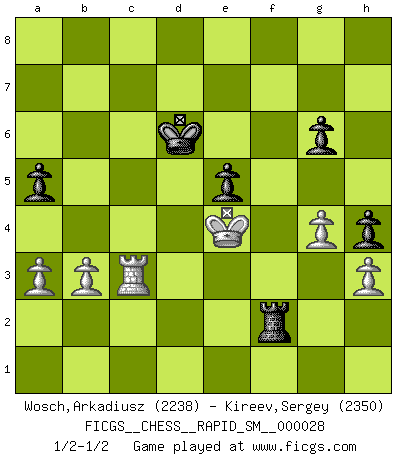 Last move : 1/2-1/2 2023 July 27 22:25:44 [Event "FICGS__CHESS__RAPID_SM__000028"] [Site "FICGS"] [Date "2023.05.05"] [Round "1"] [White "Wosch,Arkadiusz"] [Black "Kireev,Sergey"] [Result "1/2-1/2"] [WhiteElo "2238"] [BlackElo "2350"] 1.e4 c5 2.Nf3 d6 3.d4 cxd4 4.Nxd4 Nf6 5.Nc3 a6 6.Be3 e5 7.Nb3 Be6 8.f3 h5 9.Qd2 Nbd7 10.Nd5 Bxd5 11.exd5 g6 12.O-O-O Nb6 13.Kb1 Nbxd5 14.Bg5 Be7 15.g3 Nb6 16.Bxf6 Bxf6 17.Qxd6 h4 18.g4 Na4 19.Bc4 Qxd6 20.Rxd6 Be7 21.Rd3 Rc8 22.Bd5 Rc7 23.c3 Kf8 24.Re1 Bf6 25.h3 Kg7 26.Be4 Rd8 27.Rxd8 Bxd8 28.Kc2 b5 29.Nc1 Bf6 30.Nd3 a5 31.f4 exf4 32.Nxf4 b4 33.Nd5 Rc8 34.Bd3 bxc3 35.b3 Nc5 36.Nxf6 Kxf6 37.Bc4 Ne6 38.Bxe6 fxe6 39.Re3 Ke7 40.Rxc3 Rf8 41.Kd3 Rf2 42.a3 e5 43.Ke4 Kd6 1/2-1/2 Follow this game move after move (download)By playing at Chess then, we may learn: First: Foresight... Second: Circumspection... Third: Caution... And lastly, we learn by Chess the habit of not being discouraged by present bad appearances in the state of our affairs, the habit of hoping for a favorable chance, and that of persevering in the secrets of resources. (Benjamin Franklin) Taktik ist was man tun muß, wenn etwas zu tun ist. Strategie ist was man tun muß, wenn nichts zu tun ist. (Savielly Grigorievitsch Tartakower) Del Ajedrez se ha dicho que la vida no es lo suficientemente larga para él, pero eso es culpa de la vida, no del Ajedrez. (William Ewart Napier) Les Echecs sont affaire de jugement sensible. Savoir quand frapper et quand esquiver. (Fischer) There is far too much law for those who can afford it and far too little for those who cannot. (Derek Bok)