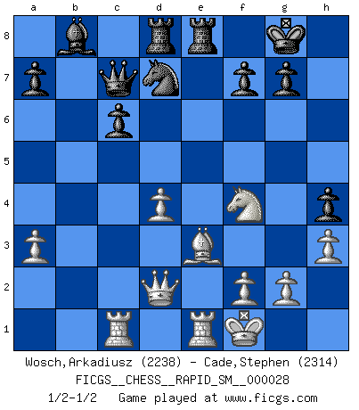 Last move : 1/2-1/2 2023 July 21 10:37:21 [Event "FICGS__CHESS__RAPID_SM__000028"] [Site "FICGS"] [Date "2023.05.05"] [Round "1"] [White "Wosch,Arkadiusz"] [Black "Cade,Stephen"] [Result "1/2-1/2"] [WhiteElo "2238"] [BlackElo "2314"] 1.e4 c6 2.d4 d5 3.Nc3 dxe4 4.Nxe4 Nf6 5.Nxf6+ exf6 6.c3 Bd6 7.Bd3 O-O 8.Qc2 Re8+ 9.Ne2 h5 10.h3 Nd7 11.Be3 Nf8 12.O-O h4 13.c4 Be6 14.Rad1 Rc8 15.Nf4 Bb8 16.Rfe1 b5 17.b3 bxc4 18.bxc4 Qc7 19.Kf1 Bd7 20.Qd2 Rcd8 21.a3 f5 22.c5 Ne6 23.Bxf5 Nxc5 24.Bxd7 Nxd7 25.Rc1 1/2-1/2 Follow this game move after move (download)If cunning alone were needed to excel, women would be the best Chess players. (Albin) Ich hatte Angst gegen einen russischen Großmeister zu verlieren, und er befürchtete gegen einen kleinen Jungen zu verlieren. (über ein Remis gegen Juri Awerbach). (Robert James Fischer) El Ajedrez es realmente noventa y nueve por ciento calculación. (Soltis) La vie et les Echecs sont tous les deux une lutte constante. (Lasker) Internet: Absolute communication, absolute isolation. (Paul Carvel)