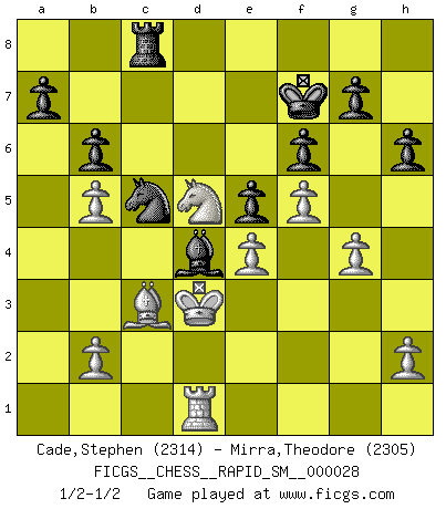 Last move : 1/2-1/2 2023 May 24 11:33:47 [Event "FICGS__CHESS__RAPID_SM__000028"] [Site "FICGS"] [Date "2023.05.05"] [Round "1"] [White "Cade,Stephen"] [Black "Mirra,Theodore"] [Result "1/2-1/2"] [WhiteElo "2314"] [BlackElo "2305"] 1.d4 Nf6 2.Nf3 d5 3.g3 c5 4.Bg2 cxd4 5.O-O e6 6.Nxd4 e5 7.Nb3 Be6 8.c4 Nc6 9.cxd5 Nxd5 10.N1d2 Be7 11.Ne4 b6 12.Nc3 Ndb4 13.a3 Qxd1 14.Rxd1 Rc8 15.axb4 Bxb3 16.Bh3 Bxd1 17.Bxc8 Bb3 18.Bb7 Kd7 19.b5 Na5 20.Bd5 Bxd5 21.Nxd5 Ra8 22.Bd2 Nb3 23.Rd1 Bd6 24.Bc3 Ke6 25.e4 f6 26.f4 Bc5+ 27.Kf1 Rc8 28.f5+ Kf7 29.g4 Bd4 30.Ke2 h6 31.Kd3 Nc5+ 32.Ke2 Nb3 33.Kd3 Nc5+ 1/2-1/2 Follow this game move after move (download)A sacrifice is best refuted by accepting it. (Wilhelm Steinitz) Der Umstand, daß uns eine 7 Stunden Zeitkontrolle ermöglicht eine großartige, tiefe Partie zu spielen, ist für die Massenmedien nicht weiter von Bedeutung. (Alexej Shirov) Un jugador que es sorprendido, esta derrotado a medias. (Proverbio) Il vaut toujours mieux jouer un plan faux de façon logique que de n'avoir pas de plan du tout. (Victor Kortchnoï) A cynic is a man who knows the price of everything but the value of nothing. (Oscar Wilde)