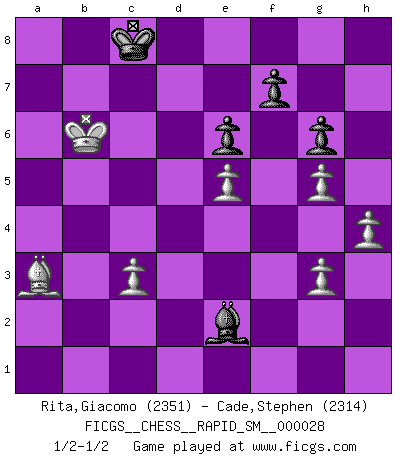 Last move : 1/2-1/2 2023 July 19 11:2:47 [Event "FICGS__CHESS__RAPID_SM__000028"] [Site "FICGS"] [Date "2023.05.05"] [Round "1"] [White "Rita,Giacomo"] [Black "Cade,Stephen"] [Result "1/2-1/2"] [WhiteElo "2351"] [BlackElo "2314"] 1.e4 c6 2.d4 d5 3.e5 c5 4.Nf3 cxd4 5.Nxd4 Nc6 6.Nxc6 bxc6 7.Bd3 e6 8.O-O Ne7 9.Nd2 Ng6 10.Nf3 a5 11.Re1 Ba6 12.Bxg6 hxg6 13.Bg5 Qc7 14.Rb1 Bc5 15.a3 Bb6 16.b4 axb4 17.axb4 c5 18.Be3 d4 19.bxc5 Bxc5 20.Bxd4 Be7 21.Qd2 O-O 22.c3 Rfb8 23.Rbd1 Bc4 24.Qf4 Ra2 25.Rc1 Bd5 26.Ng5 Bxg5 27.Qxg5 Qc4 28.h3 Qd3 29.Qe3 Qxe3 30.Rxe3 Rd2 31.Rg3 Be4 32.Rg4 Bf5 33.Be3 Bxg4 34.Bxd2 Bf5 35.Bf4 Rb1 36.Rxb1 Bxb1 37.Kf1 Bd3+ 38.Ke1 Kf8 39.h4 Ke7 40.Kd2 Bc4 41.Ke3 Kd7 42.Bg5 Bd5 43.g3 Bc4 44.Kd4 Bd5 45.Bc1 Bf3 46.Ke3 Bd5 47.Ba3 Ke8 48.f4 Bc4 49.Kd4 Be2 50.Bd6 g5 51.fxg5 g6 52.Kc5 Kd7 53.Kb6 Kc8 54.Ba3 1/2-1/2 Follow this game move after move (download)The passed Pawn is a criminal, who should be kept under lock and key. Mild measures, such as police surveillance, are not sufficient. (Aaron Nimzovich) Ohne Leiden bildet sich kein Charakter. (Ernst Freiherr von Feuchtersleben) Yo siempre he tenido un ligero sentimiento de lástima por una persona que no tiene conocimiento del Ajedrez. (Siegbert Tarrasch) Je crois qu'il existe des manières très spécifiques de jouer efficacement contre une machine. Evidemment, nous n'avons aucune chance en technique pure, parce que l'ordinateur calcule de manière parfaite. Mais lorsque nous faisons appel à notre cerveau, en utilisant l'intuition et la compréhension, alors nous restons beaucoup plus forts. (Anatoli Karpov) History is the quarrels of popes and kings, with wars or pestilences in every page; the men all so good for nothing, and hardly any women at all. (Jane Austen)